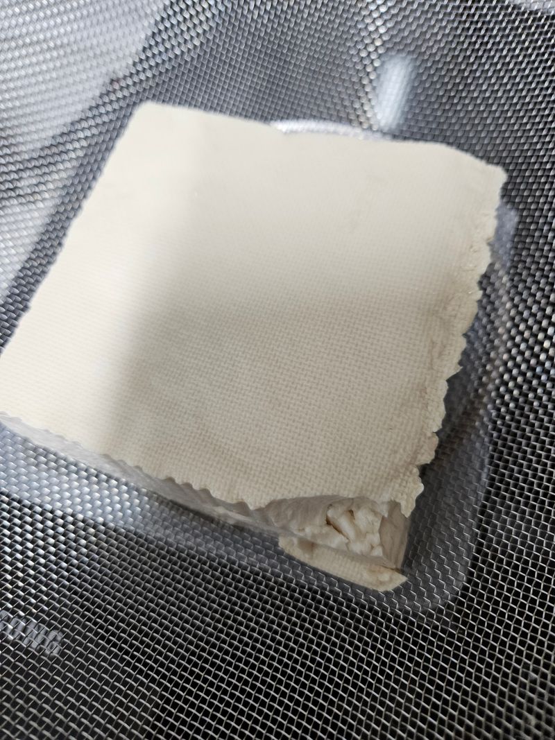 두부를 체반에 받쳐 놓고 아이를 하원 시키러 다녀왔어요. 그 사이 물이 많이 빠져있어서 따로 키친타올 까진