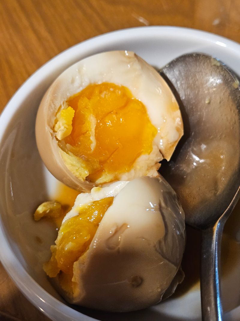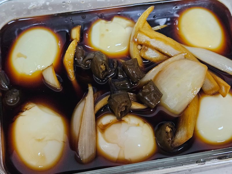 4. 달걀을 까서 간장 베이스에 넣는다.