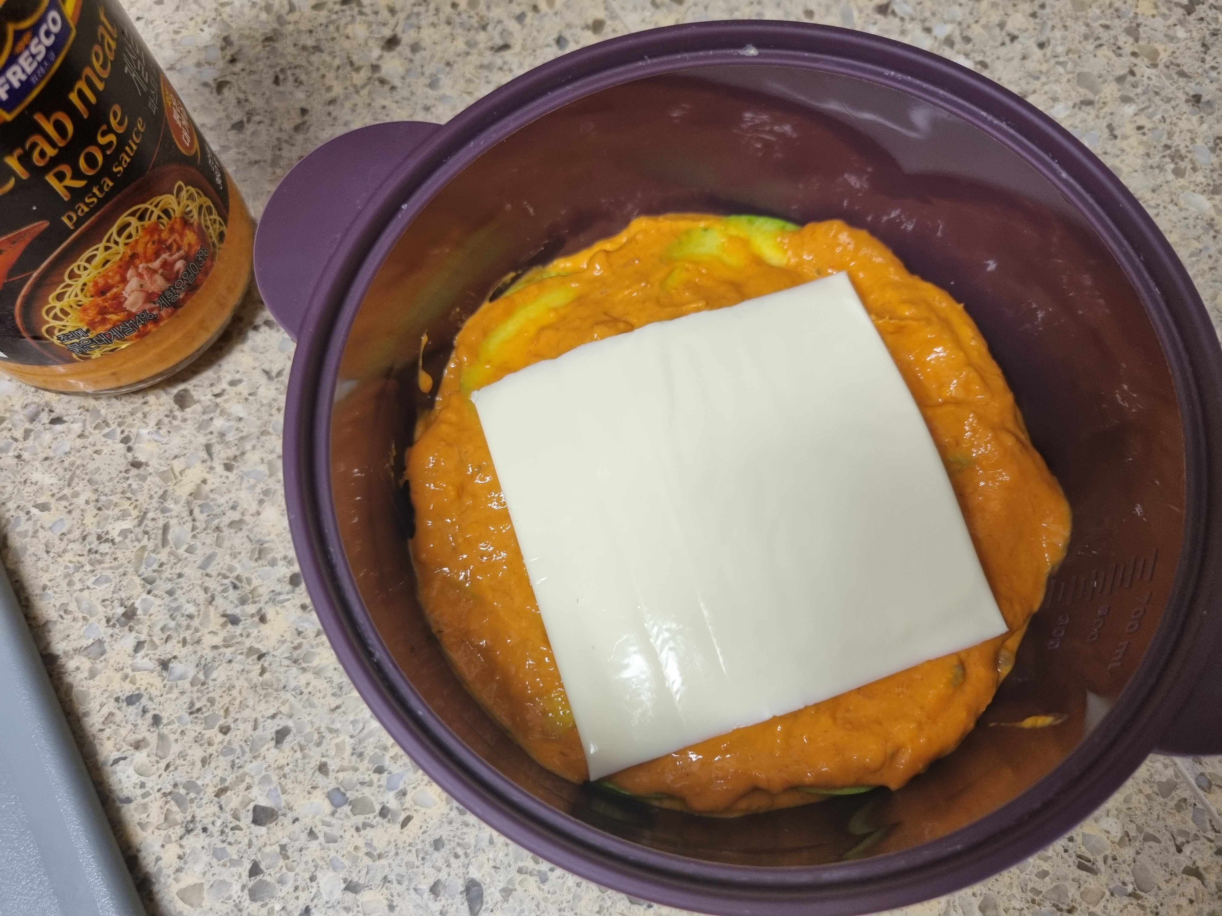 애호박을 먹기 좋은 사이즈로 썰고, 로제소스와 계란 풀었는 것을 넣고, 치즈를 덮은 후 밀가루가 들지 않은 칼로리가 낮은 가벼운 반찬하나를 뚝딱 만들었습니다.