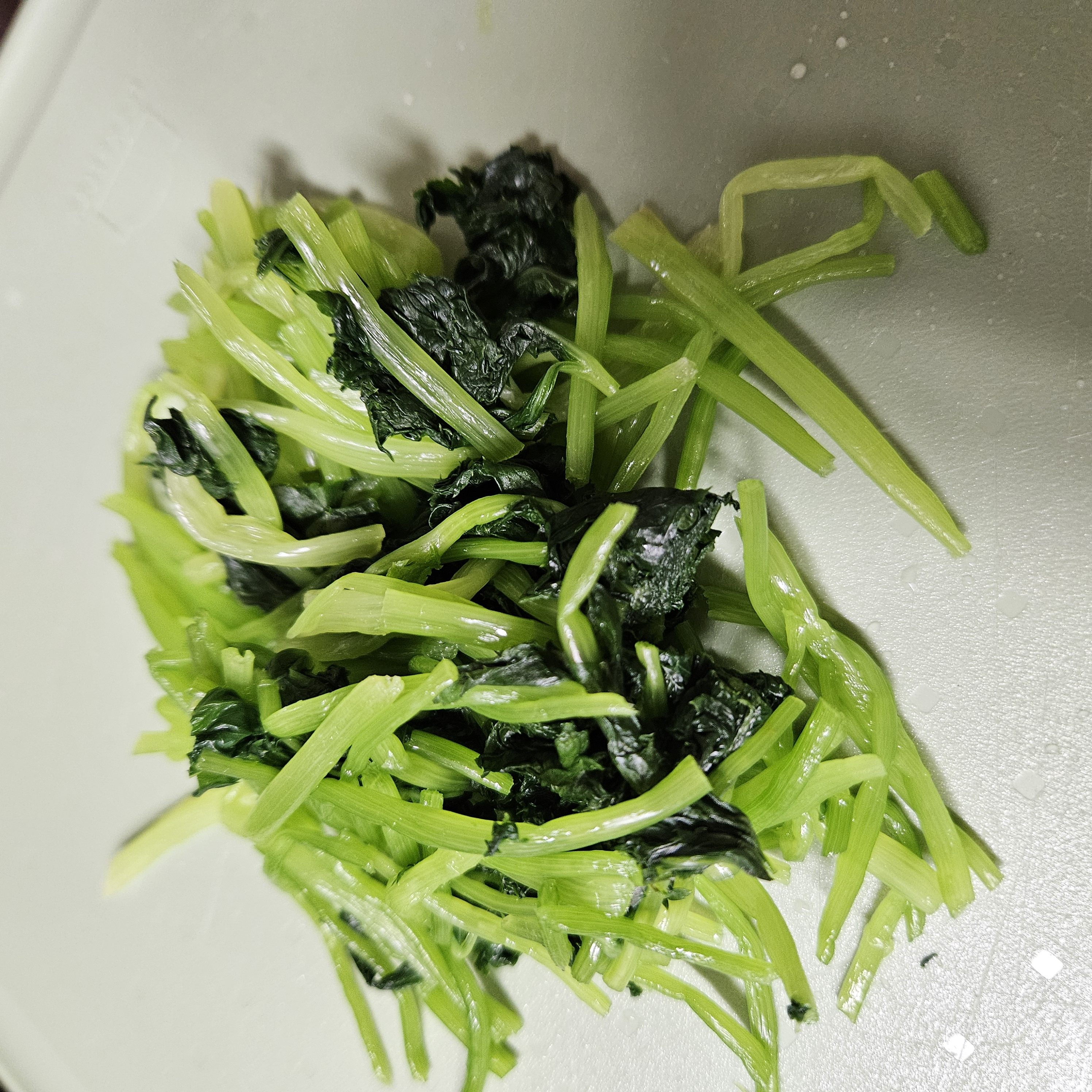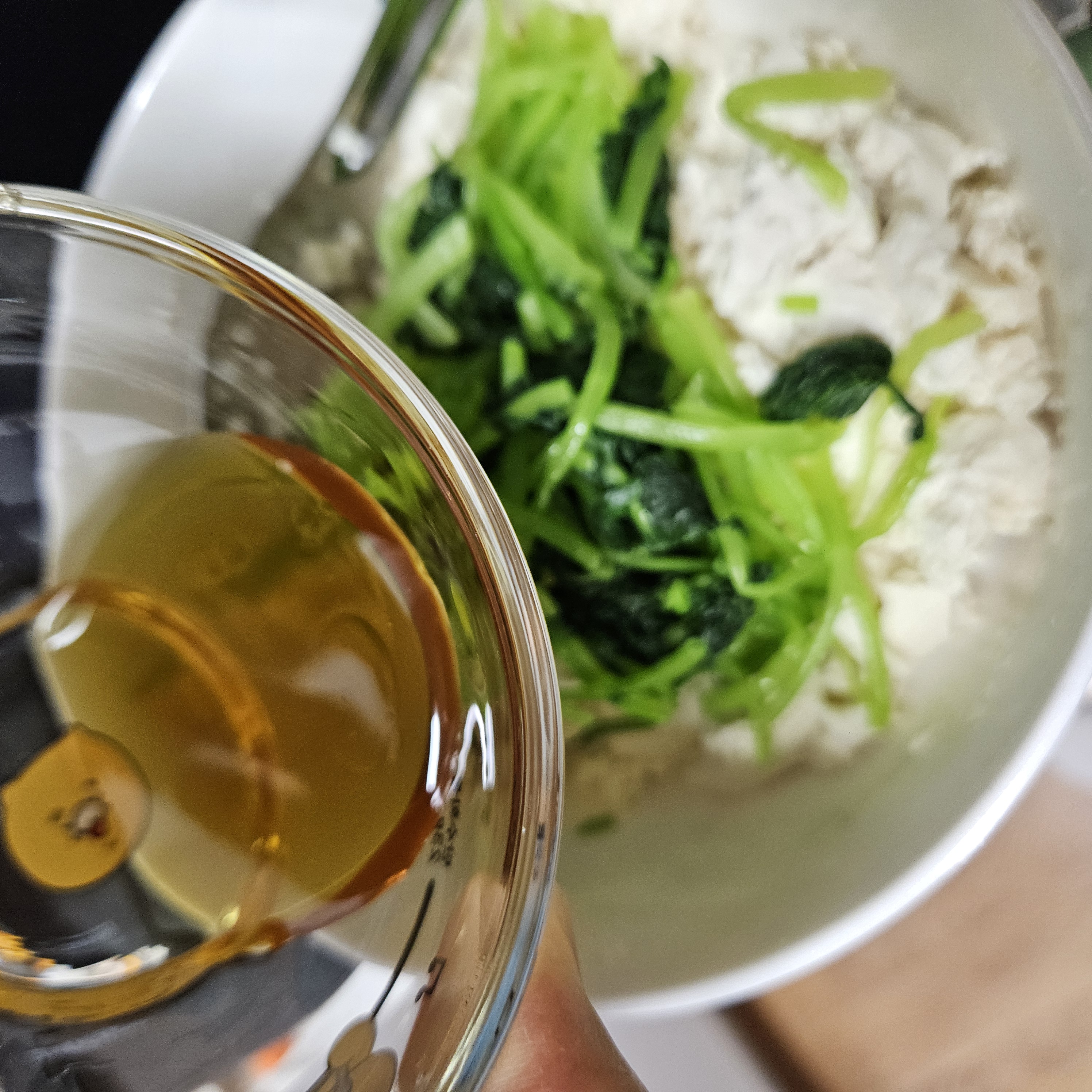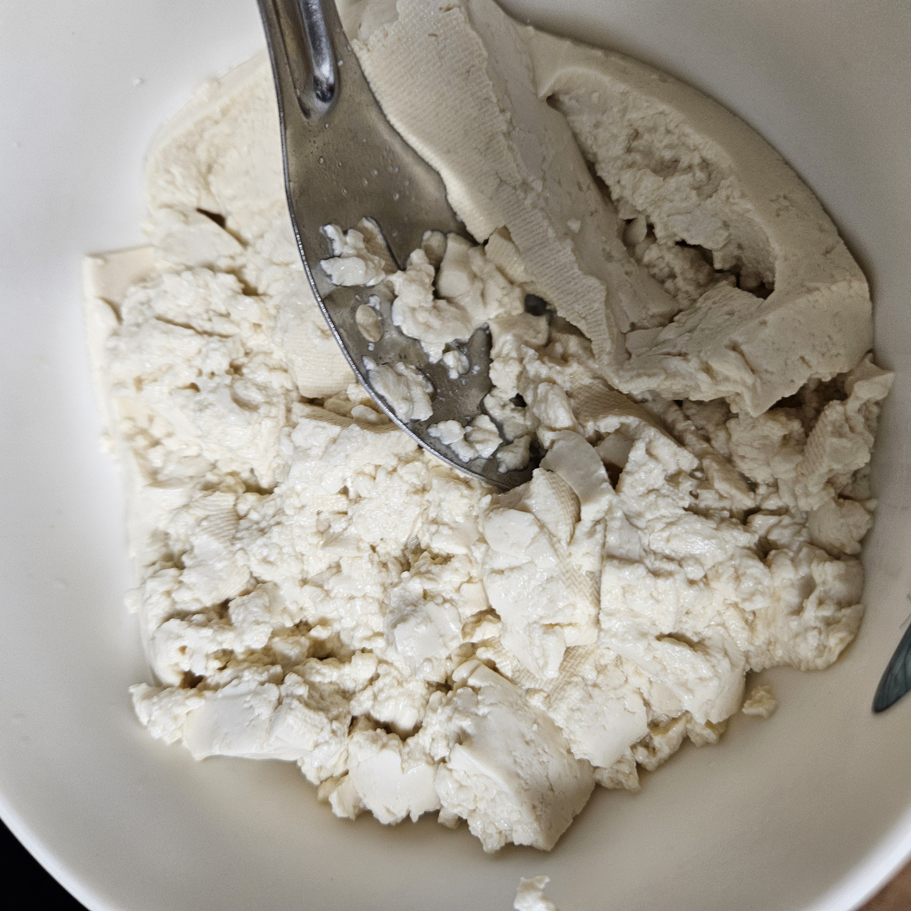 그래도 여전히 남아있는 물기는 키친 타올로 닦아 없애줬고요~ 큰 볼에 부두를 으깨고.. 데친 참나물 3~4센치 길이로 쫑쫑 썰어서 양념 넣고 섞어줬어요.