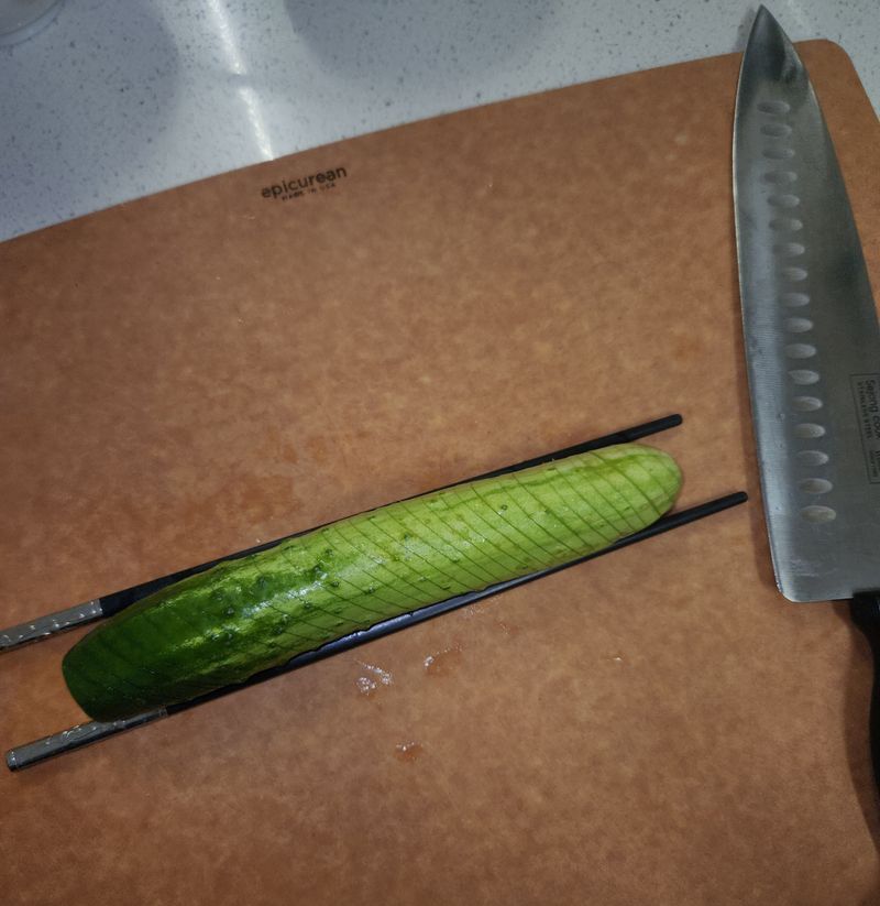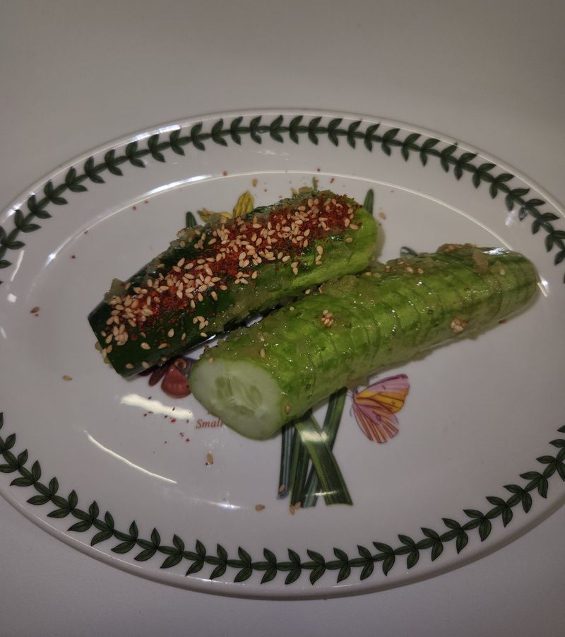 만드는 과정은 정말 간단했어요! 오이를 자를 때 젓가락을 양옆에 딱 고정해두고 대각선으로 잘라주니까 칼집이 일정하고 안정적으로 들어가서 훨씬 편했어요! 꿀팁 감사합니당💚 양쪽 모두 사선으로 칼집을 내어주면 스프링처럼 쫘악- 늘어나는 게 정말 신기하더라고요. 그리고 양념장까지 너무 고소하고 맛있었어요!!