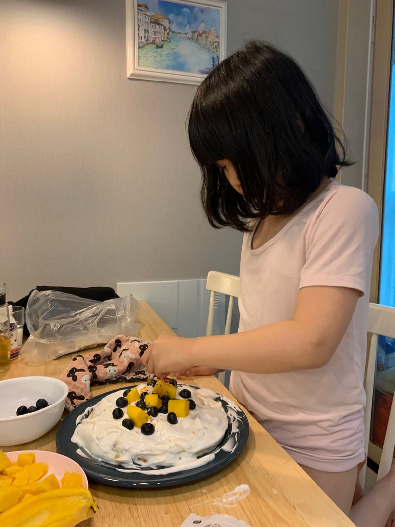 아이가 좋아하는 핫케이크 가루로 케익을 만들었어요! 핫케이크빵에 생크림 그리고 이이가 좋아하는 망고와 블루베리까지! 프링글스까지 올려 케익느낌 물신~! 맛있는 케이크 완성했습니다 ^^