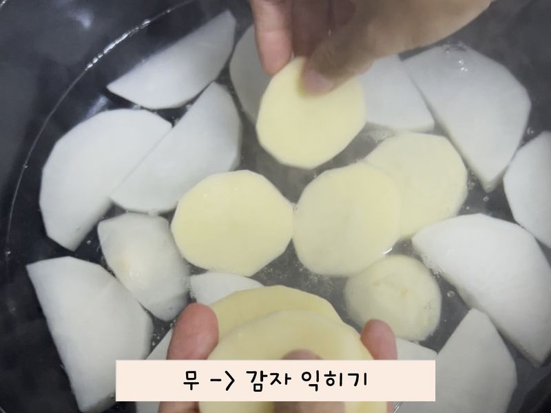 무와 감자를 먼저 끓이고 양념에 버무린 생선과 나머지 재료들을 넣고 냄비 뚜껑을 닫고 기다리다가 뚜껑을 딱 열었는데, 끓이면서 무에서 올라온 수분으로 모든 재료들에 재료가 스며들어 잘박한 국물이 있는 동태 조림이 완성되어 있었어요🥳