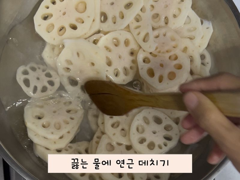 연근의 아삭한 식감을 위해 먼저 식초를 넣은 물에서 연근을 끓이라는 새미네부엌의 꿀팁도 놓치지 않고 잘 따라서 만들었습니다.