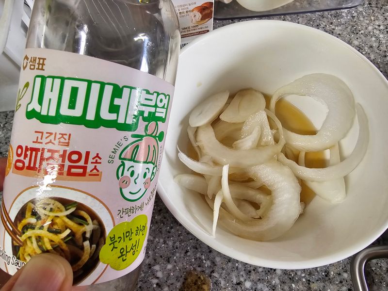 그래서 제가 가장 좋아하는 양파절임 소스로 양파 절여서 얹어서 먹었는데