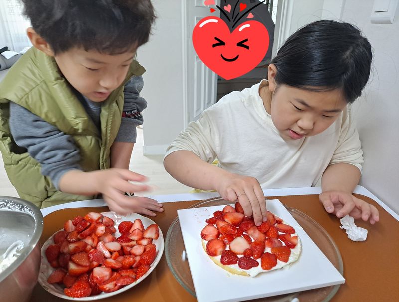 할머니 생신을 위해 남매가 뭉쳤어요. 서툰 솜씨지만 마음만은 유명파티쉐! 고사리 손으로 생크림도 올리고 딸기도 올려 새콤달콤 맛있는 케이크를 만들었어요. 모양은 조금 부족할 지 모르지만, 그 맛 만큼은 세상 어떤 케이크와도 비교불가! 세상 하나뿐인 케이크랍니다. 서로 머리를 맡대고 열심히 하는 모습이 너무 이쁘죠?