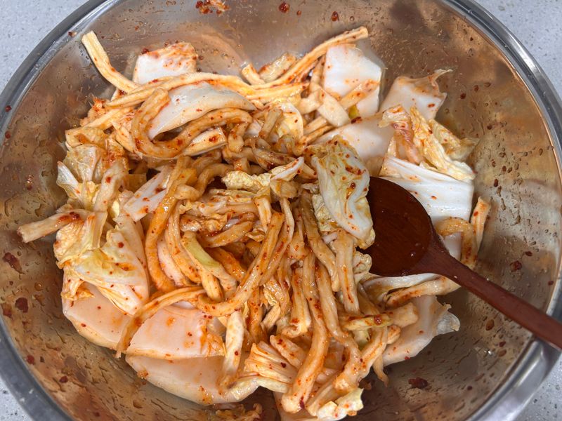 배추에 양념 섞을 때는 포인트 하나 - 빨래하듯이 힘 있게 빡빡! 버무리기!