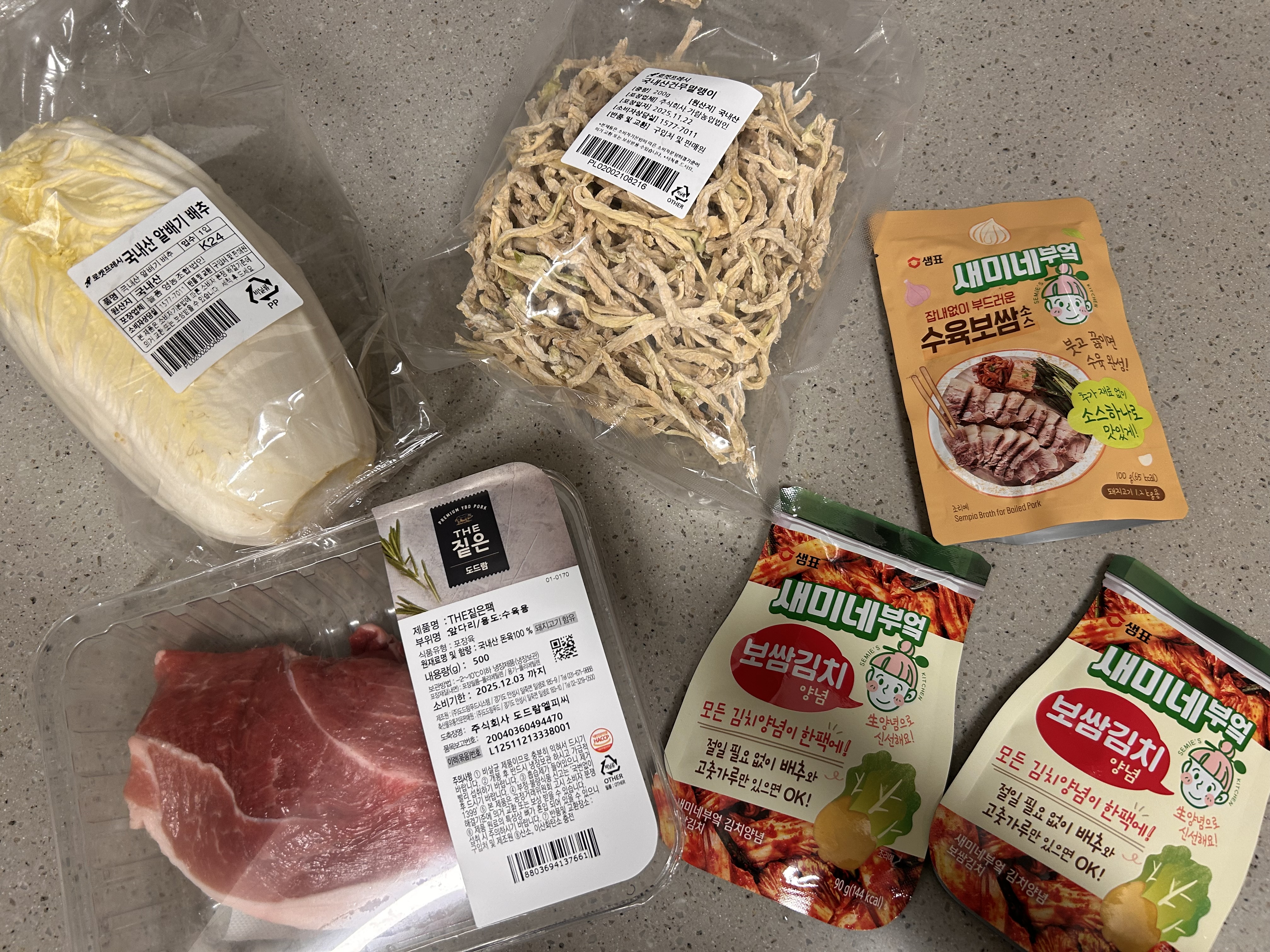 마침 새미네부엌 수육 있고, 보쌈김치 소스가 있길래 샀어요!! 건무말랭이와 알배추, 보쌈용 고기도 샀습니다!