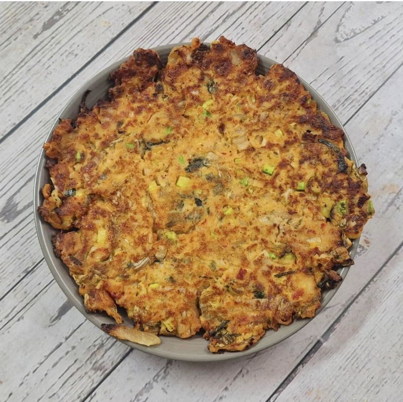 묵은지(쫑쫑),돈민찌100g,얼린두부250g(물기제거), 양파 반 개(다짐), 대파 반 대(다짐), 애호박(5cm정도 다짐), 다진마늘1, 맛술1, 간장1, 소금&후추 약간, 밀가루 4~5스푼(재료 수분에 따라 가감), 달걀 1개