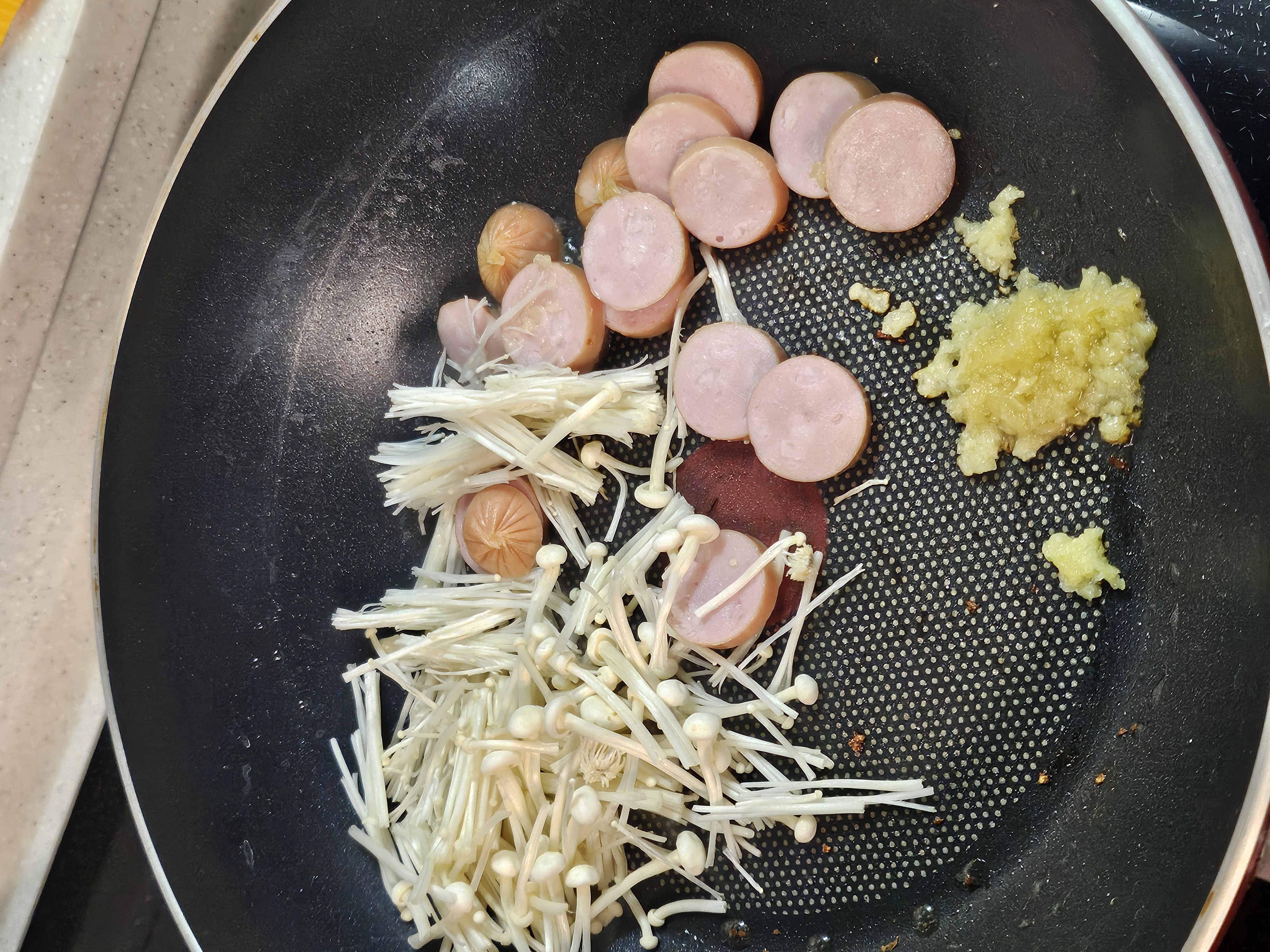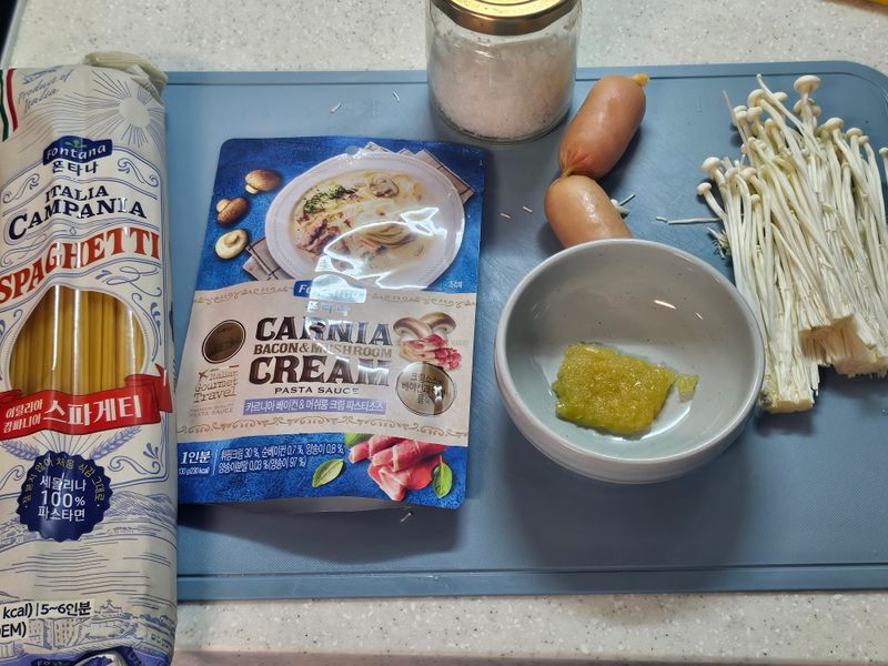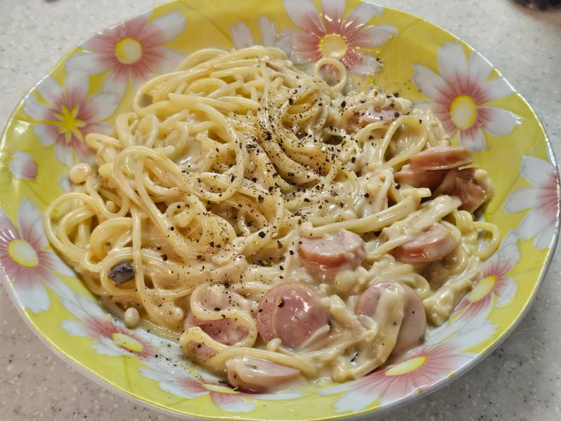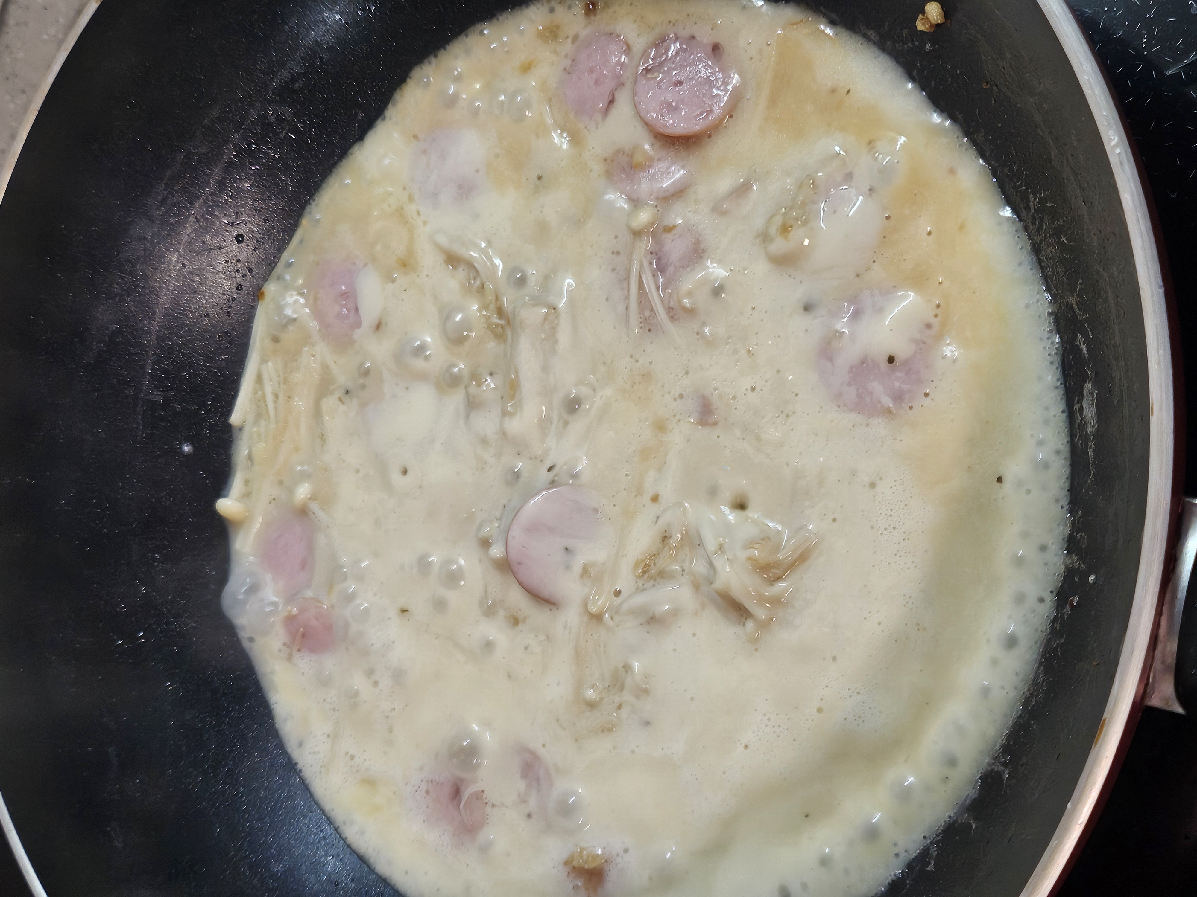 냉장고에 돌아다니던 팽이버섯도 넣어 봤는데, 오독오독한 식감이 일품이었어요! (사실 소시지를 많이 넣어서 양심에 찔렸는데, 팽이버섯 덕분에 나름 건강한 파스타를 완성했습니다ㅎㅎ) 그리고 소시지를 넣으니 고소한 크림과 짭쪼름한 소시지가 만나 맛이 더욱 잘 느껴져서 너무 좋았어요!