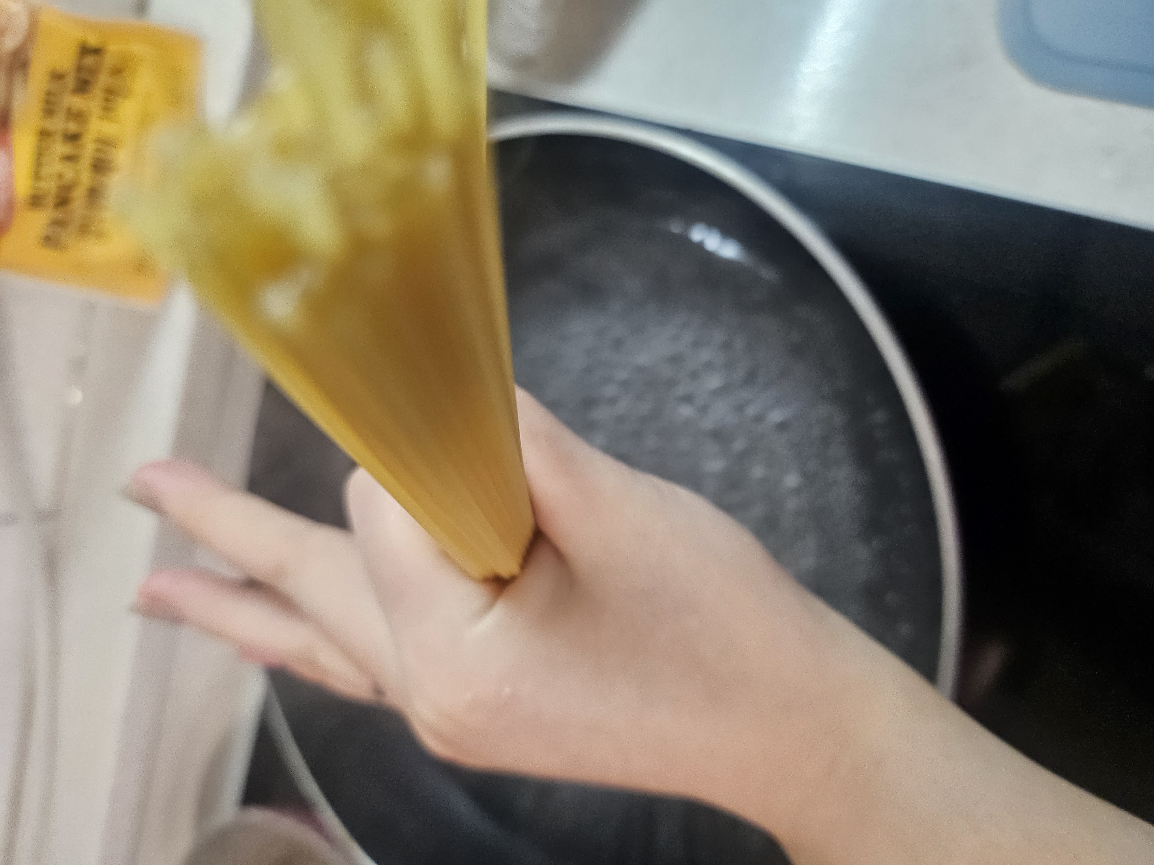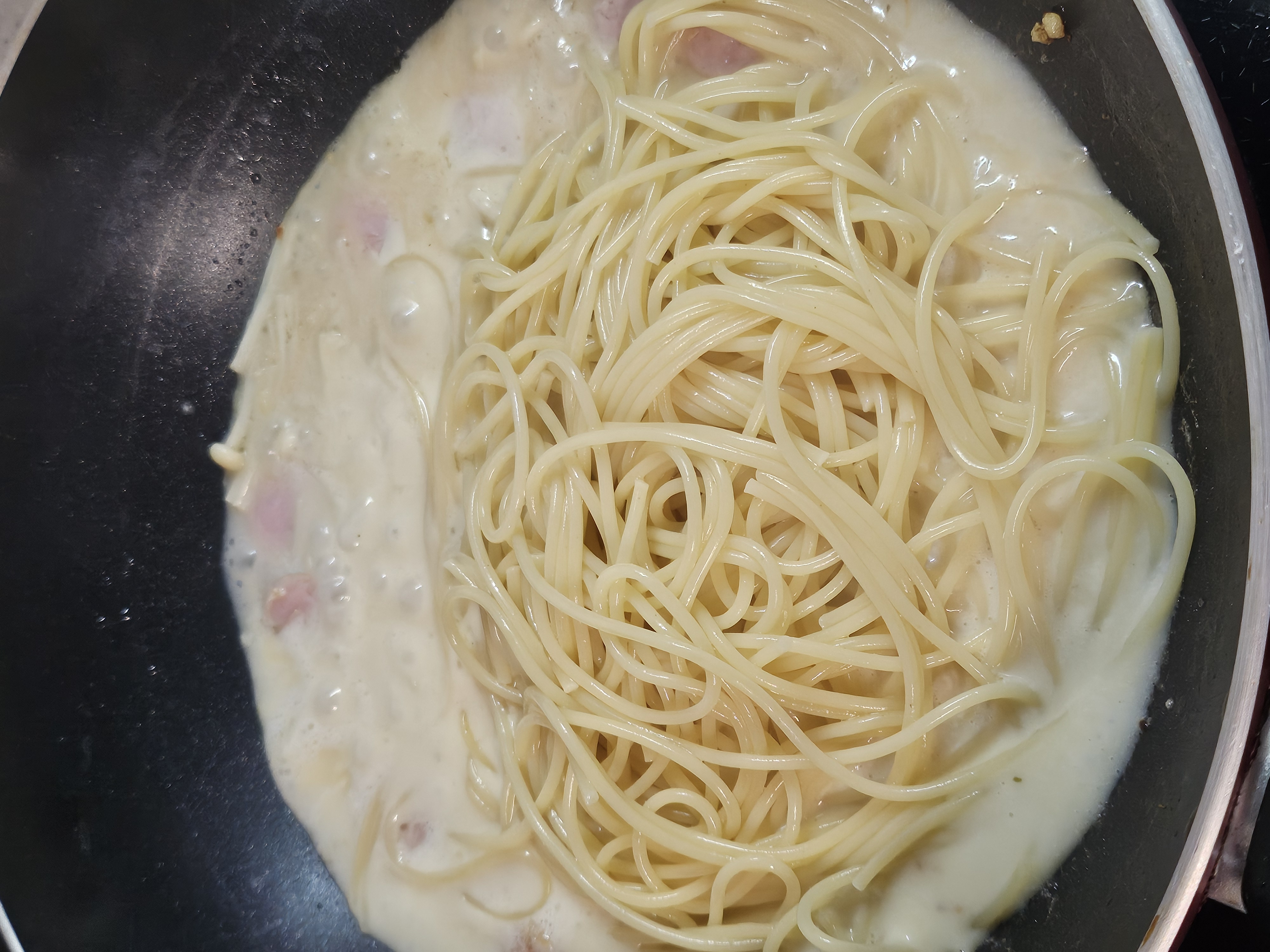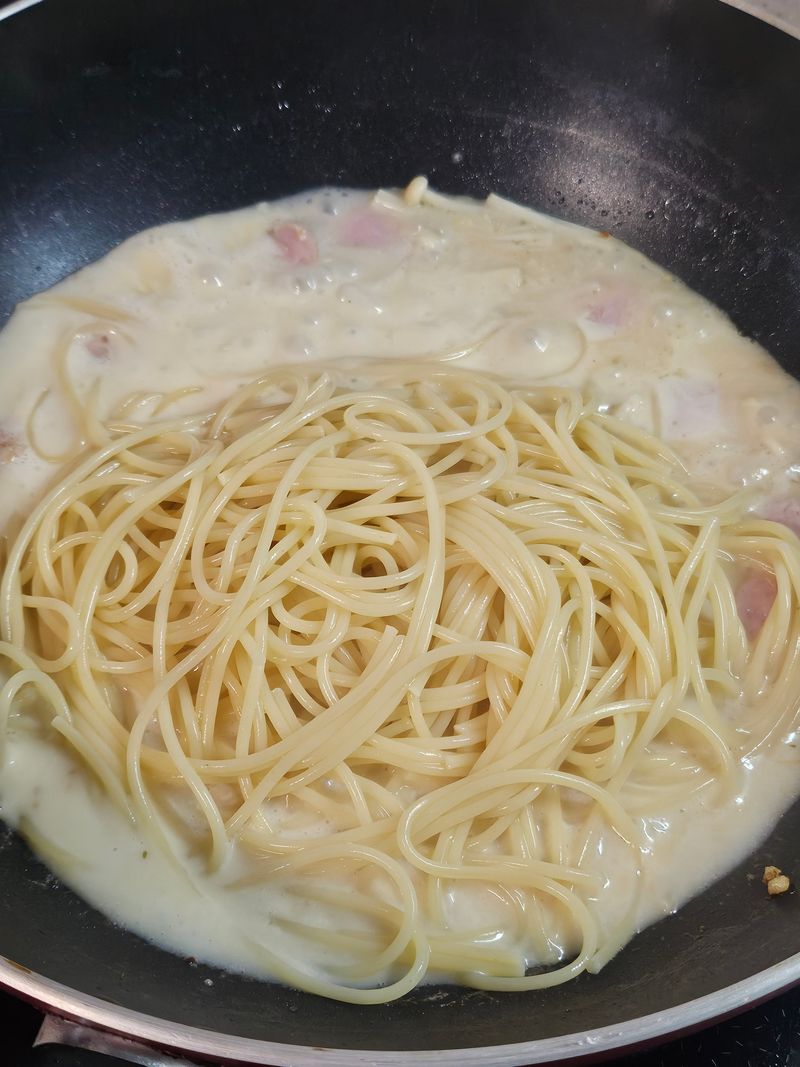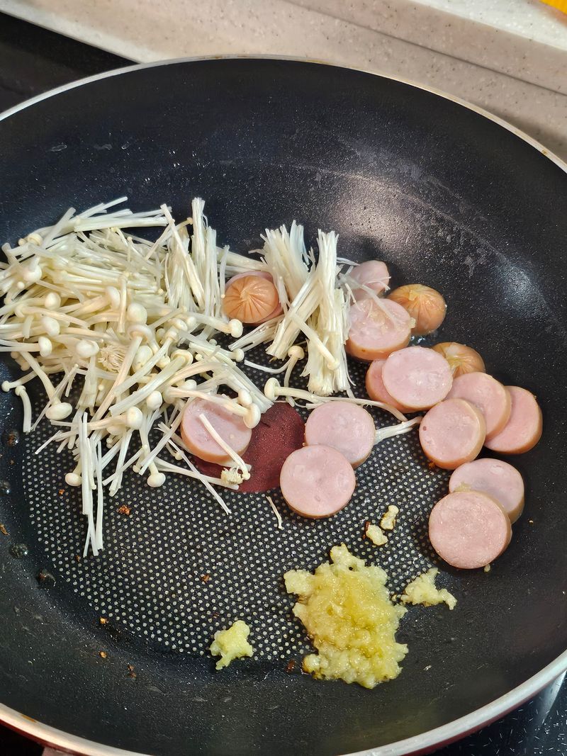 냉장고에 돌아다니던 팽이버섯도 넣어 봤는데, 오독오독한 식감이 일품이었어요! (사실 소시지를 많이 넣어서 양심에 찔렸는데, 팽이버섯 덕분에 나름 건강한 파스타를 완성했습니다ㅎㅎ) 그리고 소시지를 넣으니 고소한 크림과 짭쪼름한 소시지가 만나 맛이 더욱 잘 느껴져서 너무 좋았어요!