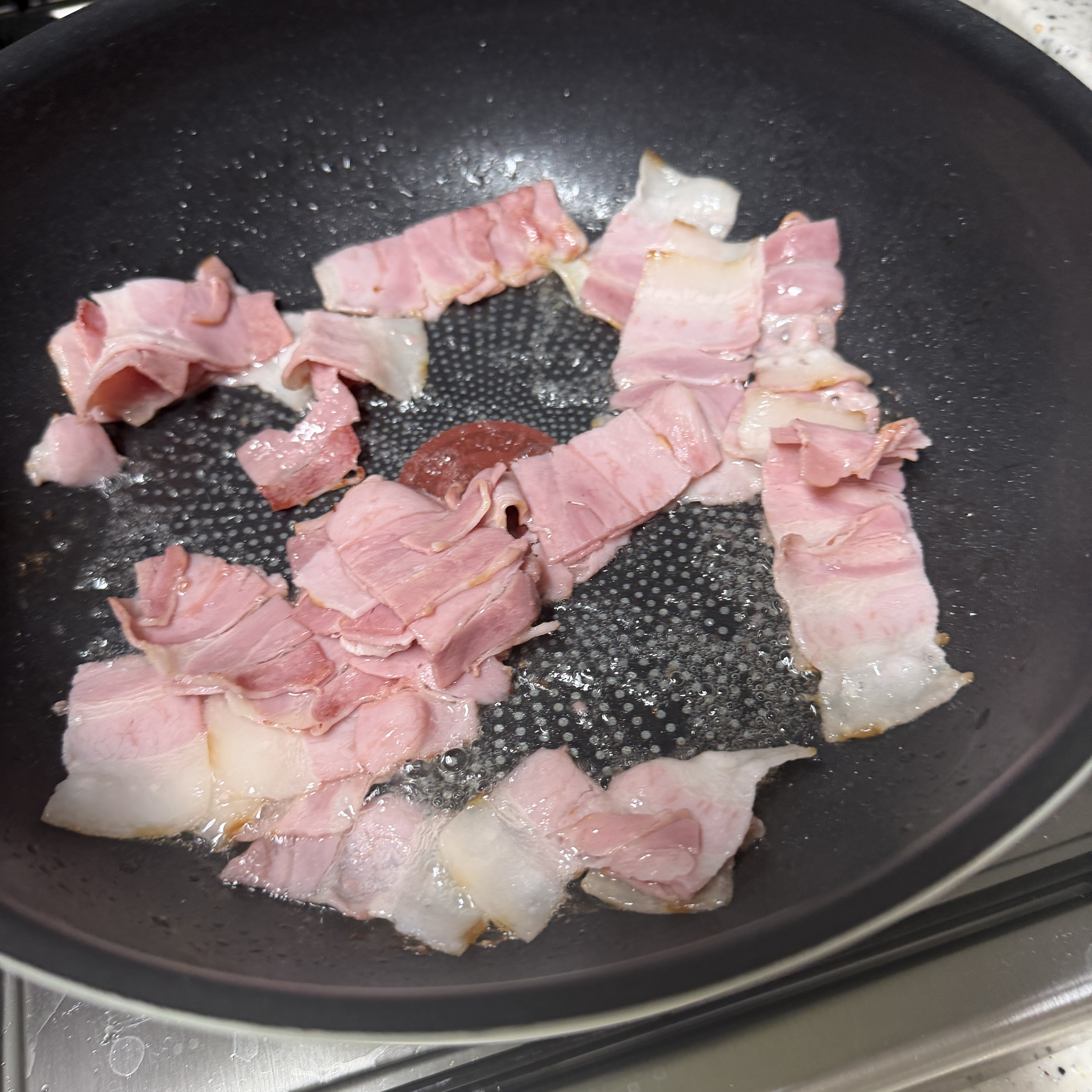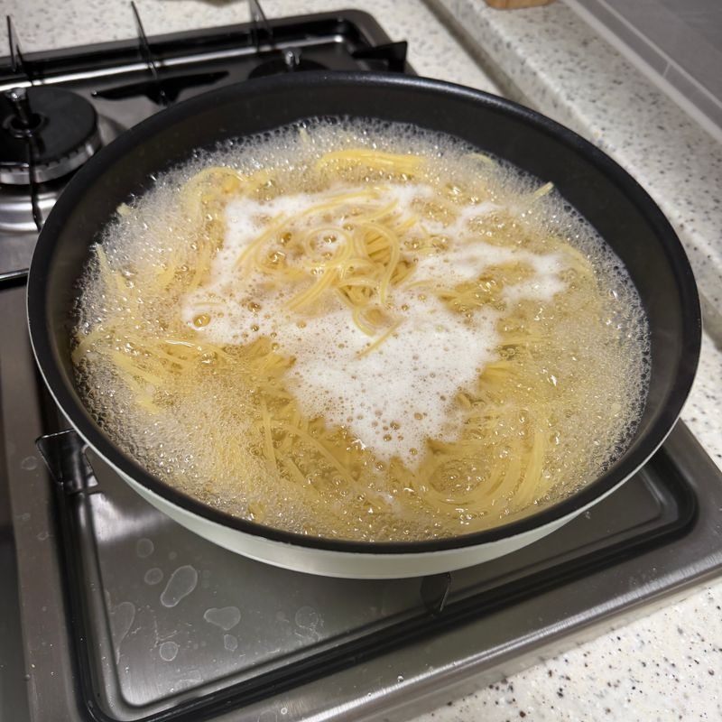 3. 볶은 재료들을 옮겨담고 파스타 면을 8분동안 삶는다