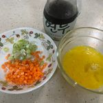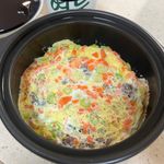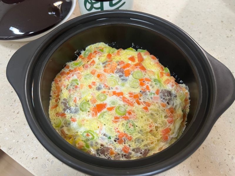 썰어둔 채소를 달걀물에 섞은 뒤 따뜻한 밥 위에 부어줍니다.