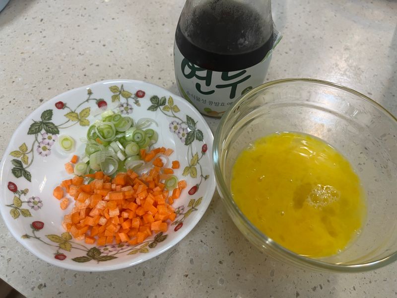 당근을 잘게 썰고, 대파는 쫑쫑 썰어 준비해요.