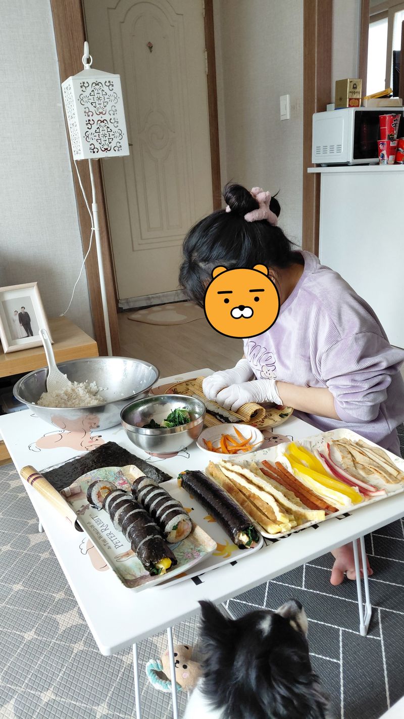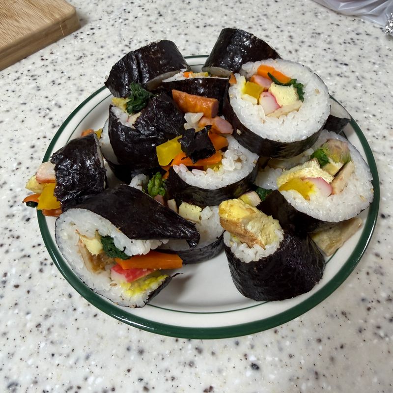 처음 해본것치고 김밥 비쥬얼이 훌륭한데요? 👏🏻👏🏻 집에서 만든 김밥은 진짜 너무 맛있는거 같아요 ㅋㅋ 기본 2-3줄 뚝딱 가능합니당🤣