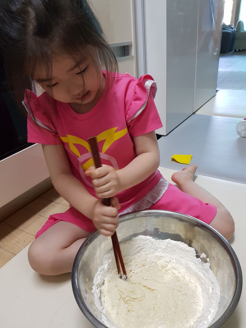 맛있게 고사리 손으로 케이크를 만들어보아요 신나게 맛있어져라 주문을 외우면서 저어봅니다