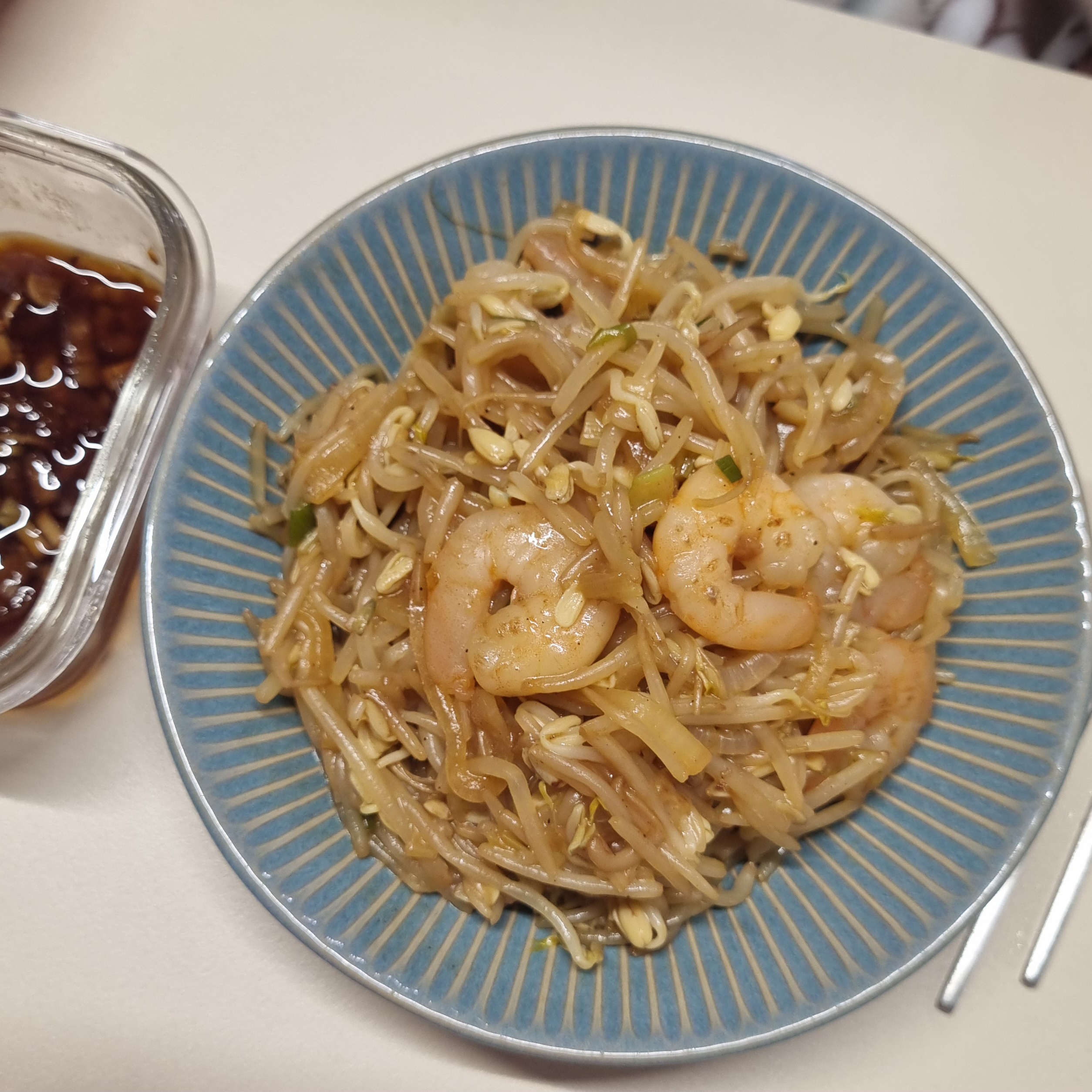 올리브유 두르고, 대파 새우 볶은 다음 숙주넣고 휘릭! 센불에 볶았어요