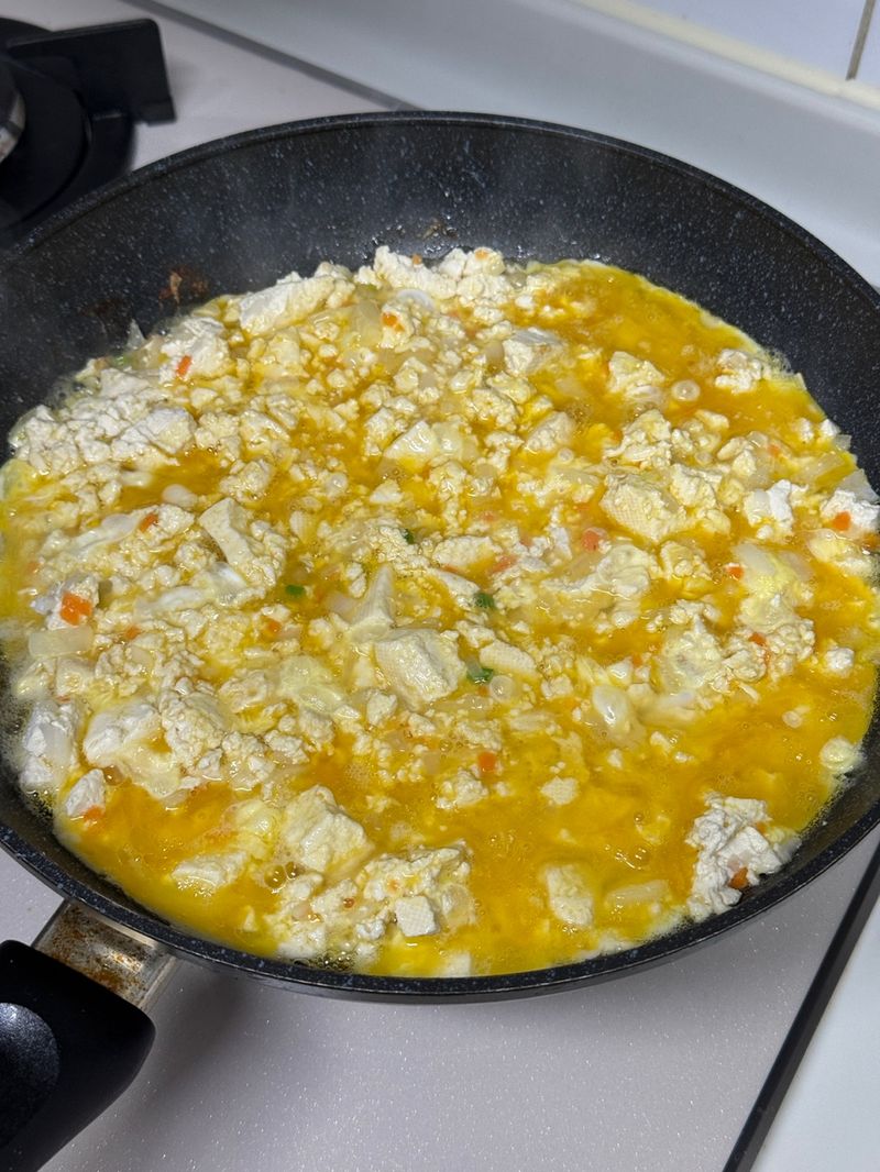 두부 으깨면서 볶다가 냉털 채소들 잘게 다져서 같이 넣어주고
