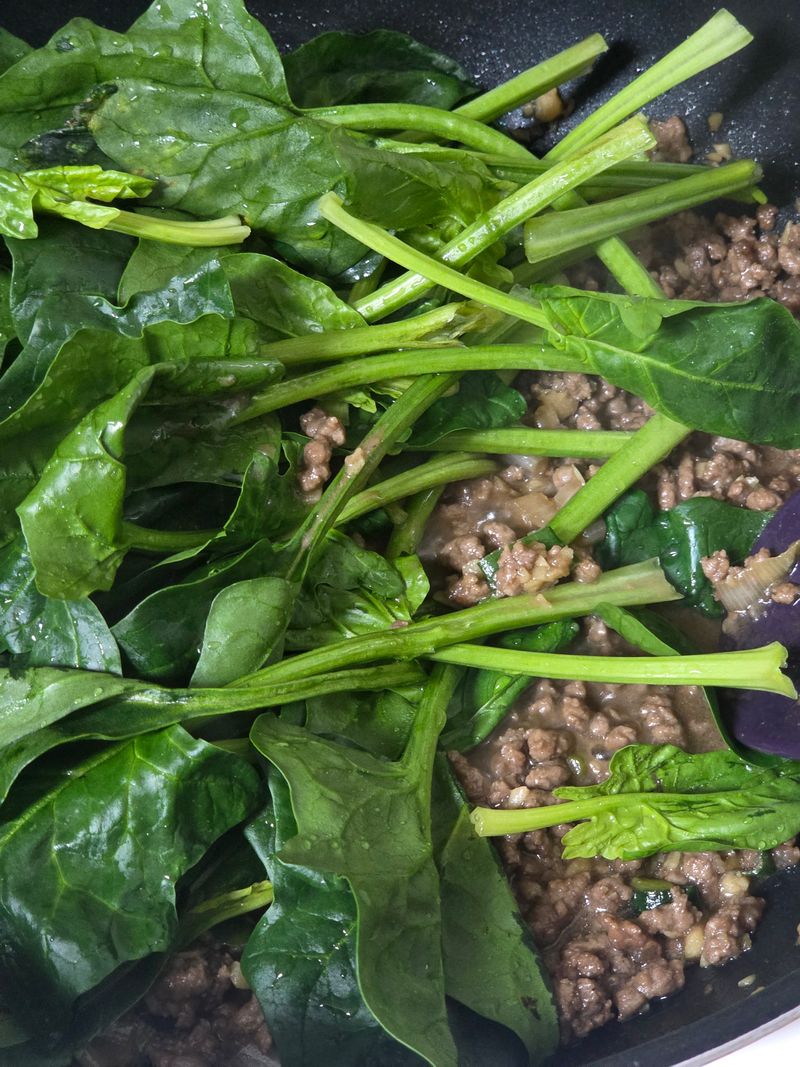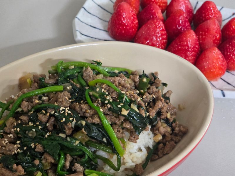 다진 소고기볶다가 잘 세척한 시금치 같이 볶볶해서 먹는 초간단덮밥인데 아이들이 너무 잘먹어요 소고기양념:진간장, 다진마늘, 매실액