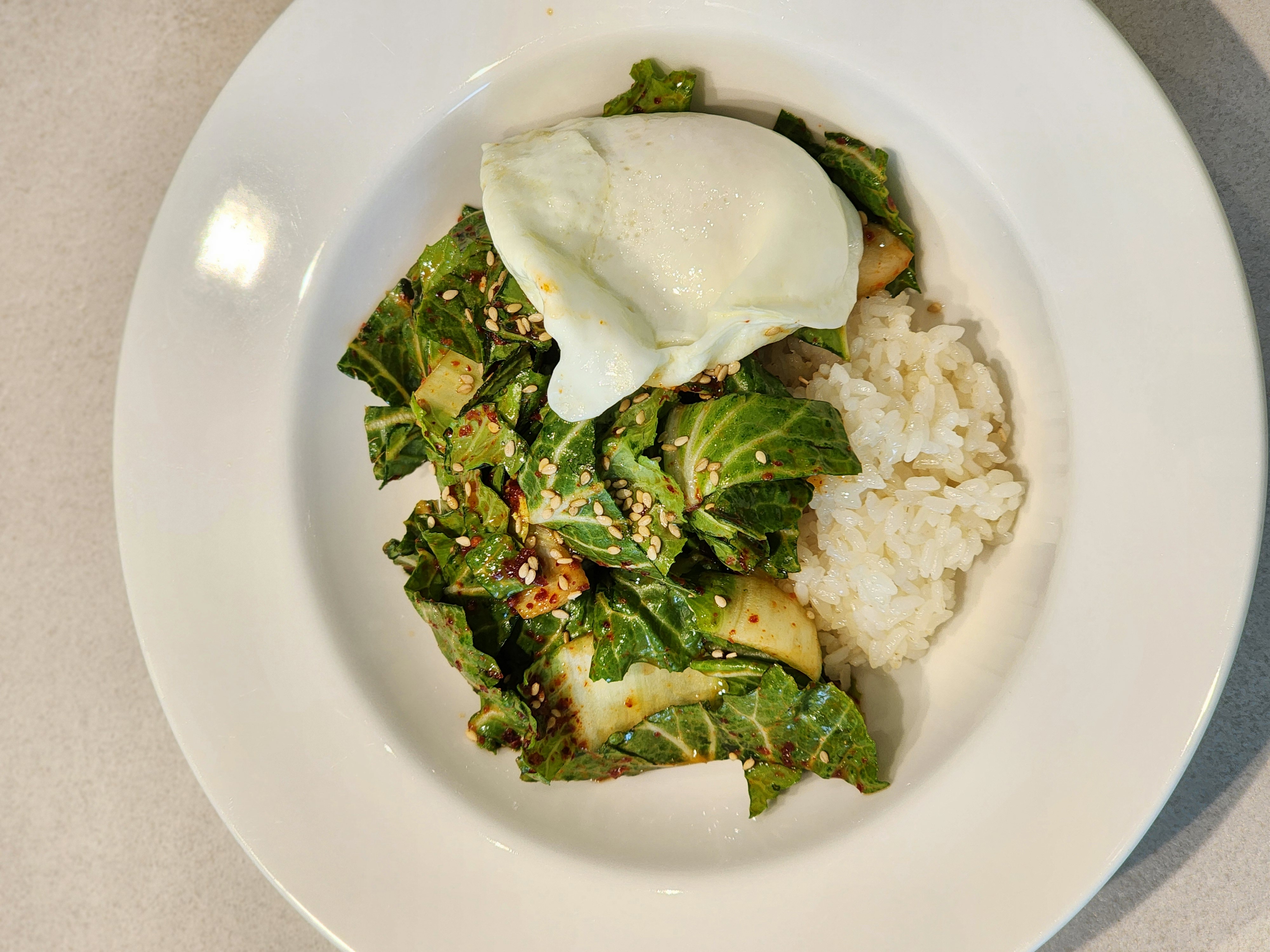 4. 밥위에 봄동겉절이 올리고 반숙계란 하나 올리면 끝.
