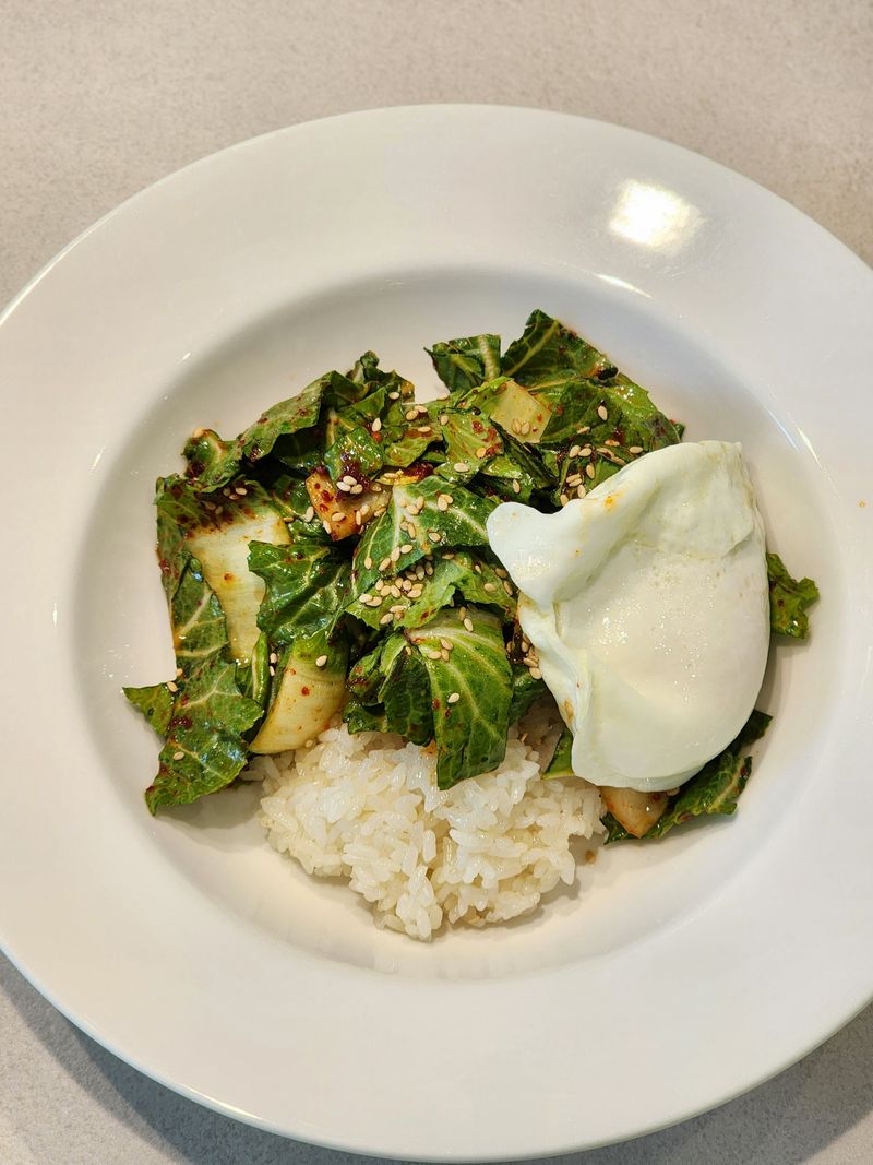 4. 밥위에 봄동겉절이 올리고 반숙계란 하나 올리면 끝.