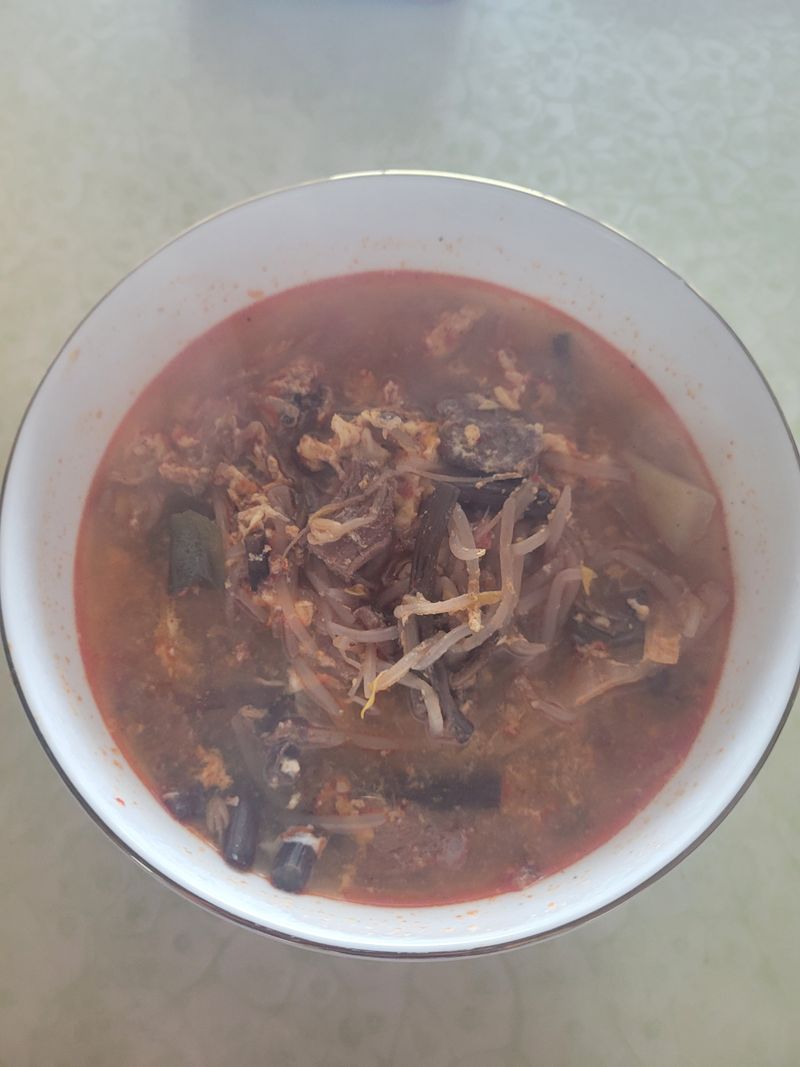 연두링과 고추기름 조금 내면 집에서도 맛있는 육개장을 끓일수 있어요...육개장의 킥은 대파를 많이 넣는것 같아요..대파가 많이 들어가면 얼큰하고 달큰한 맛이 나요. 고사리도 조금 넣어주고...팔팔 끓이다가 마지막에 계란물 휘리릭 풀어주면 끝~~