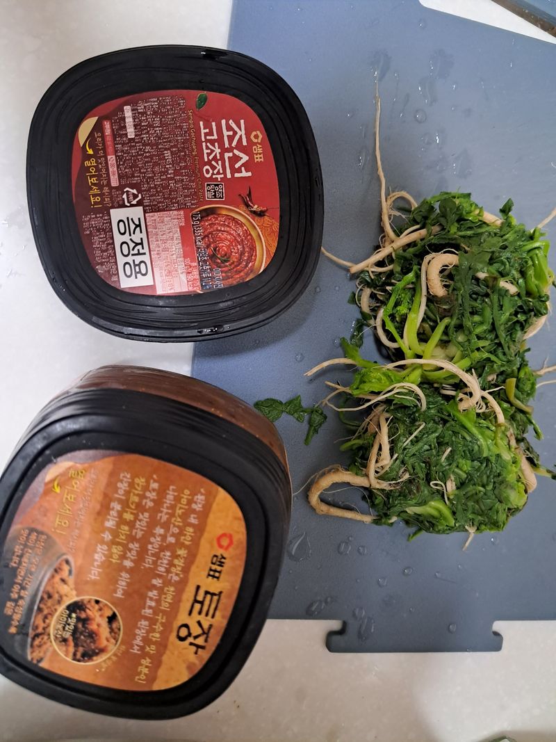 냉이를 데친 후 찬물에 잠시 넣어 물을 꼭 짜주고 된장, 고추장 넣고 들기름 넣고 다진 마늘 넣어 무쳤어요^^