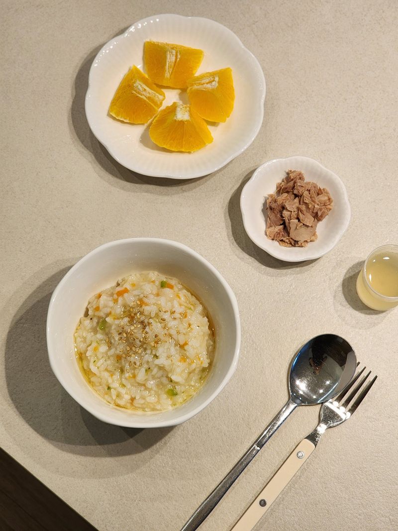 첫째가 감기 기운이 있다고 해서 아침에 야채죽 만들어줬어요.