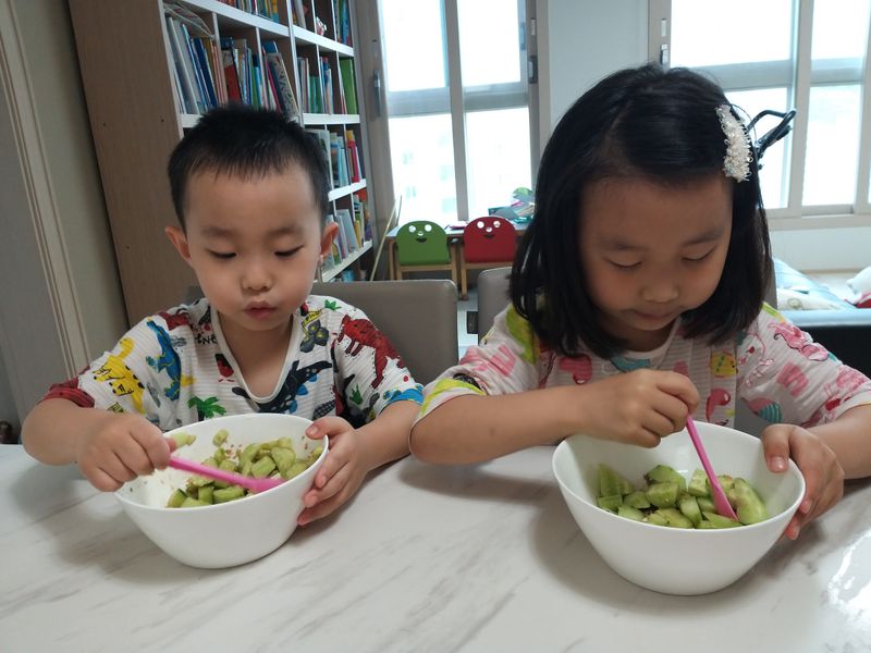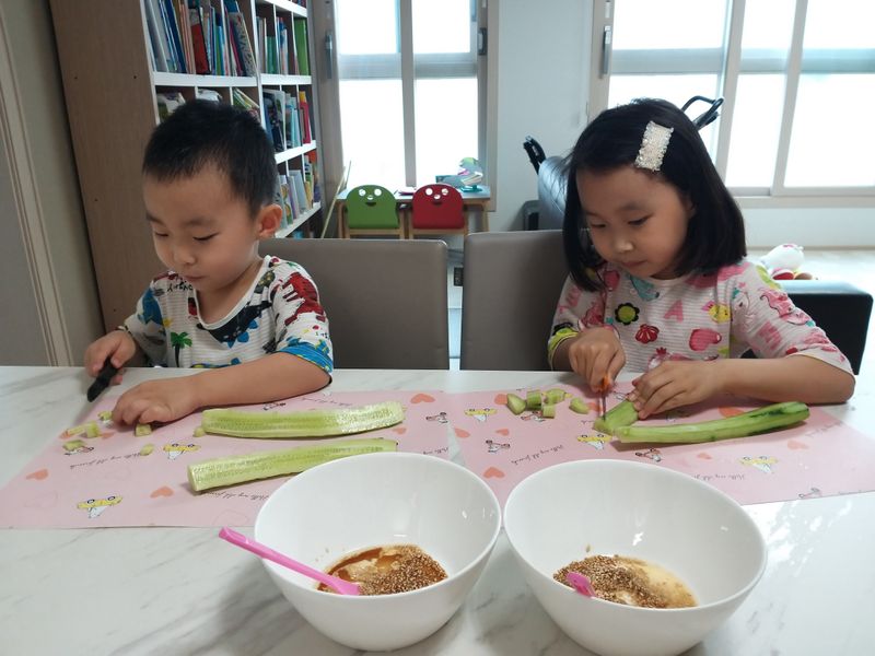 오늘저녁은 아이들과 함께 맛있는 오이무침을 만들어 보았어요. 싹뚝싹뚝 예쁘게 잘라서 오이무침 양념에 비벼비벼~~^^ 직접만들어서 그런지.. 더 맛있게 잘 먹어주는 이남매입니다~~♡ #요리해요