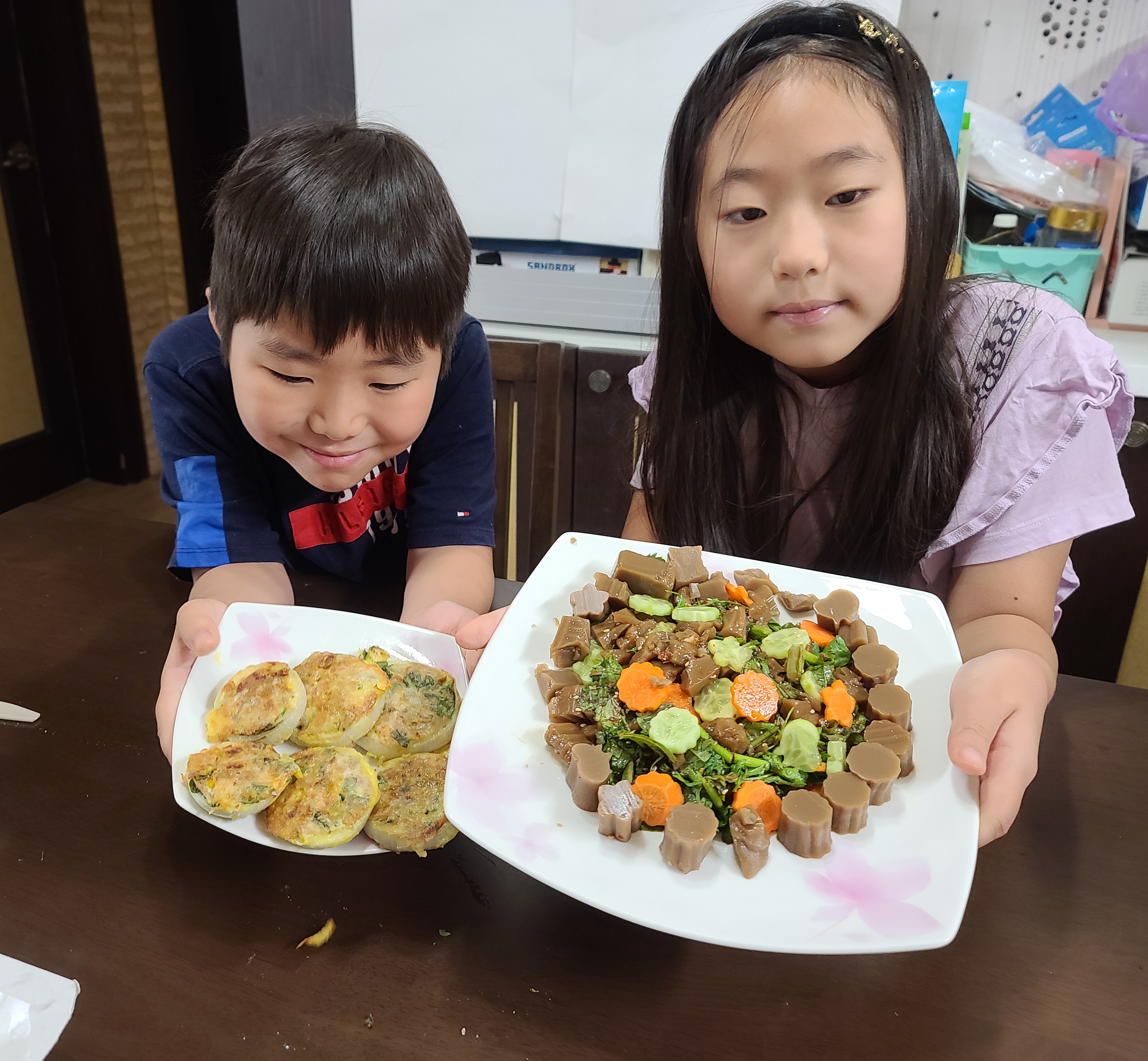 아이들이 잘 먹지 않는 채소를 이용해서 양파참치전과 도토리무침을 했어요.