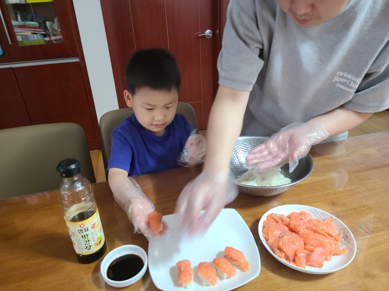 초밥을 만들어 그 자리에서 서로 먹어주기도 하면서 아빠와의 관계도 더 돈독하게 할 수 있어요. 심심한 주말에 게임만 할 것이 아니라 온 가족이 함께 식사를 만들어 보면 어떨까요?