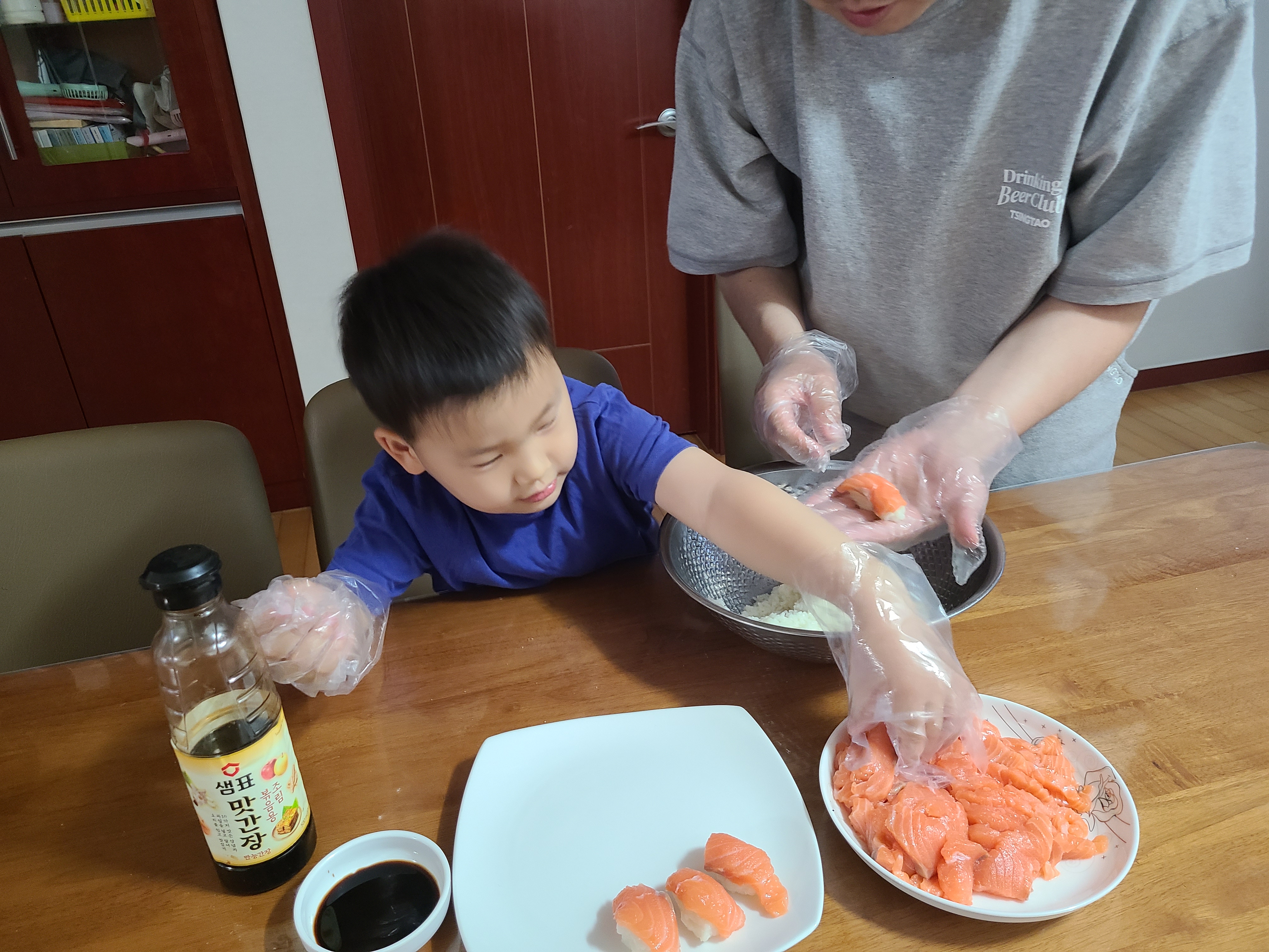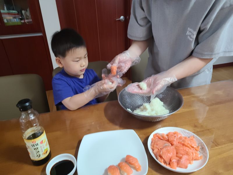 이번에는 직접 장갑을 끼고 아빠와 함께 초밥을 만들어 보았답니다.