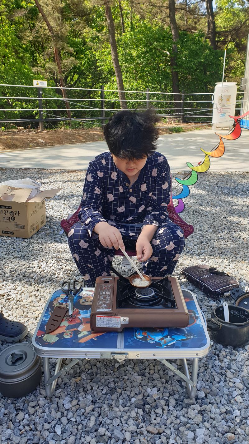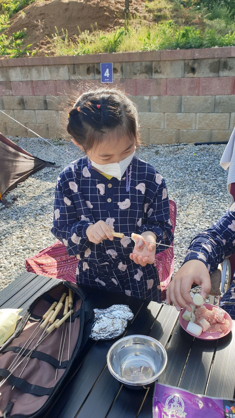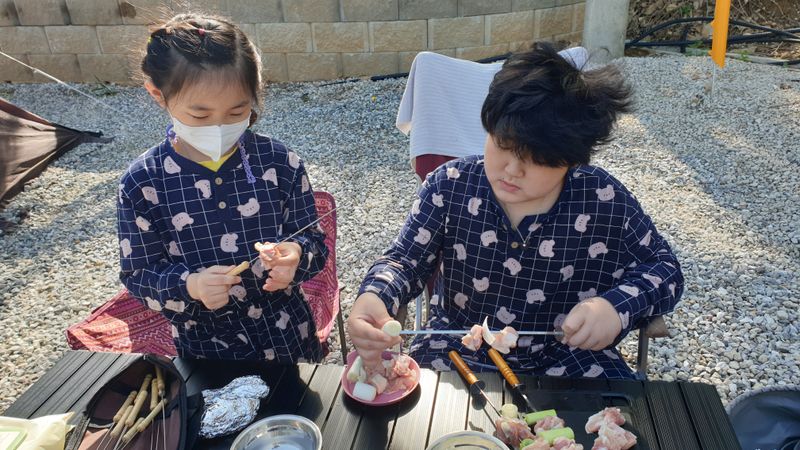 아침에 일어나 닭꼬치를 만들었어요 부스스까치머리로 열심히열심히 숯불에 노릇노릇 맛있게 구워먹어요 디저트는 달콤한 달고나♡ 엄마아빠는 우리가 만들어 더 맛있데요~