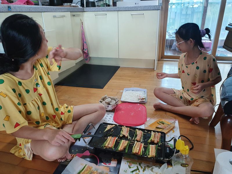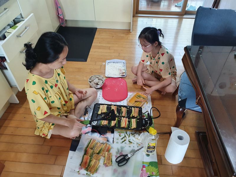 제사가 있는날 첫째가 음식중 한가지를 해보고 싶다해서 고기산적을 해봤어요 쪽파 소고기 새송이버섯 맛살 햄 이렇게 꼬지에 끼우고 부침가루 뭍히고 계란물까지 딸이 도와주네요 엄마는 굽고 하니 금방 전하나 끝냈네요 ~^^ 자다음 동그랑땡도 해볼래 하니 허리가 아프다고 눕방하러갔어요 ㅎ