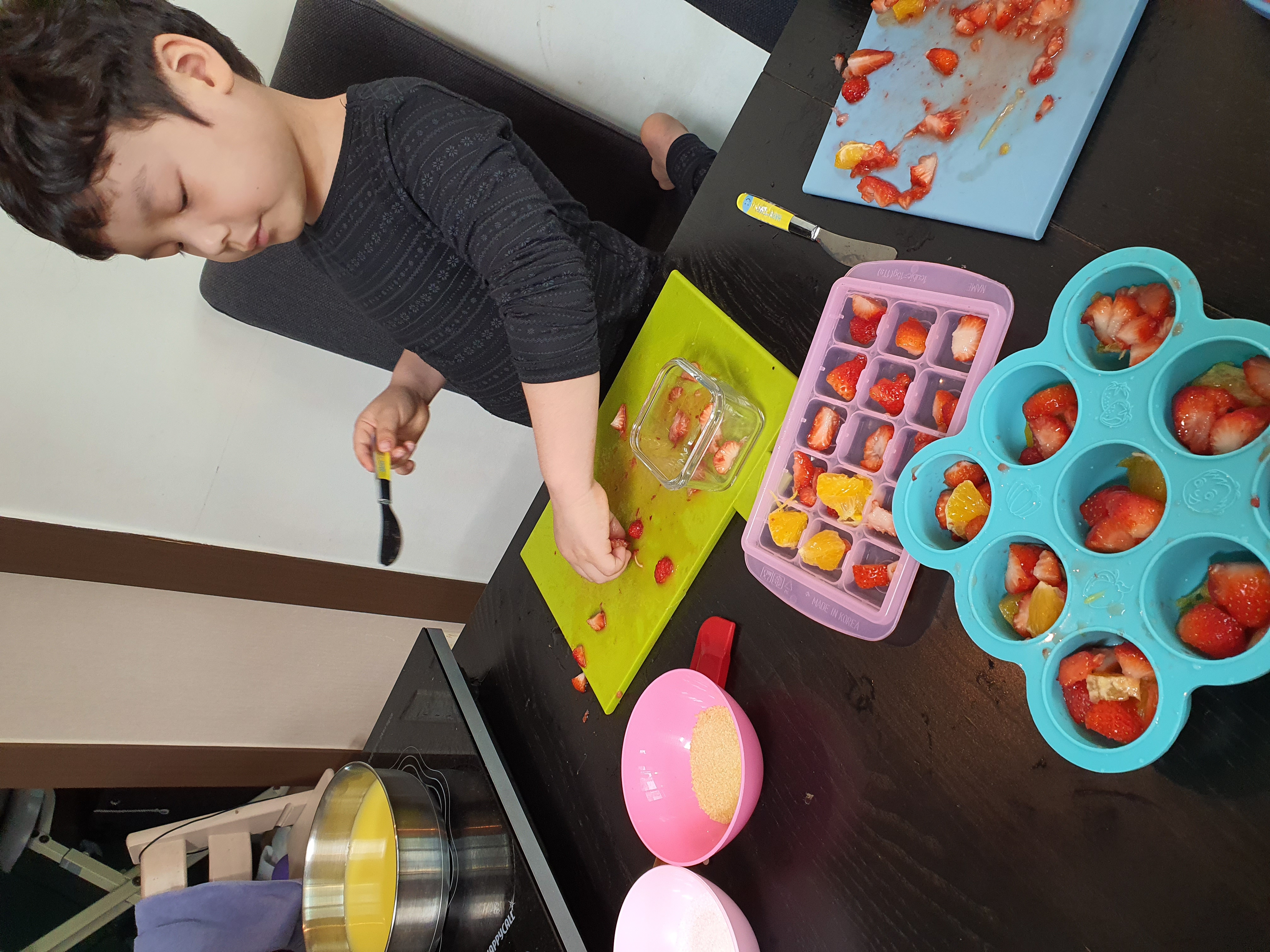 과일잘라 젤리를 만들었어요 직접만든 건강한 간식 조물조물 만들며 웃음꽃이 피어납니다~오구오구 잘먹는 동생덕에 만든 보람도 느꼈답니다