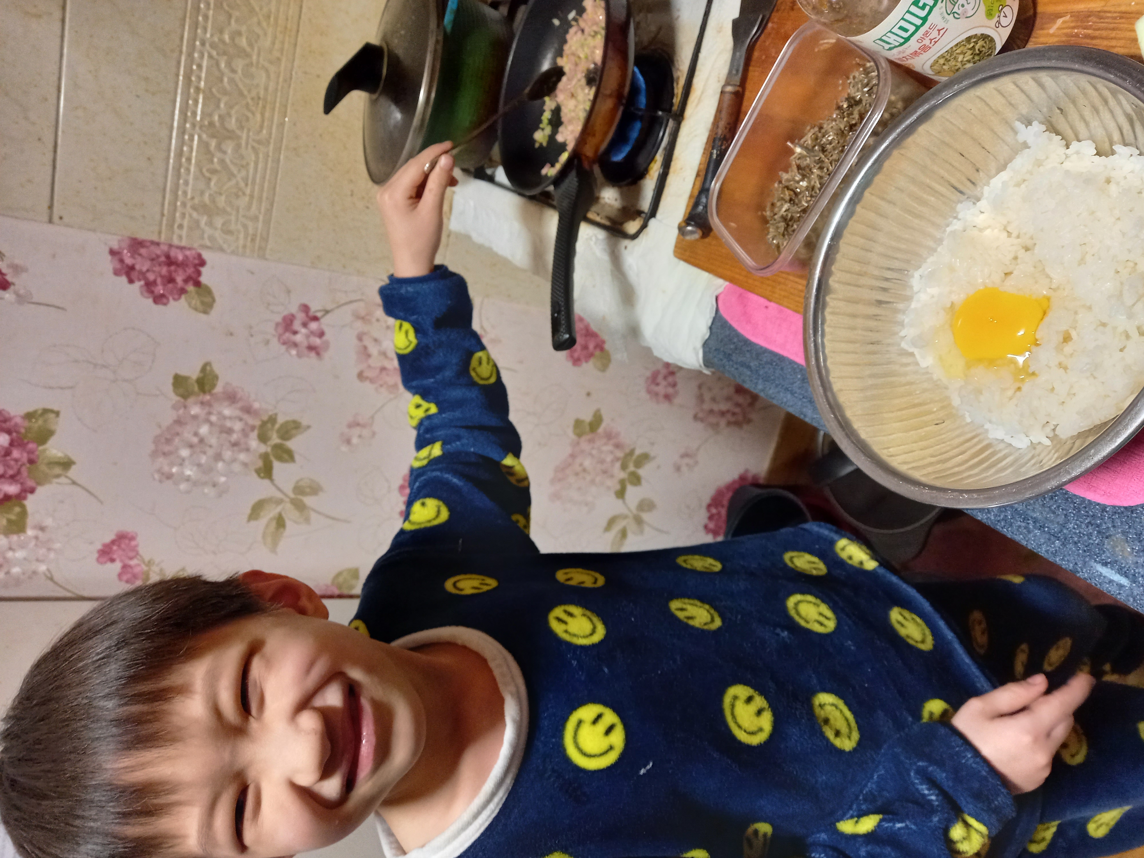 엄마의 된 밥 때문에 밥알이 데굴데굴 굴러다니자 아예 볶음밥으로 바꿔버렸죠.