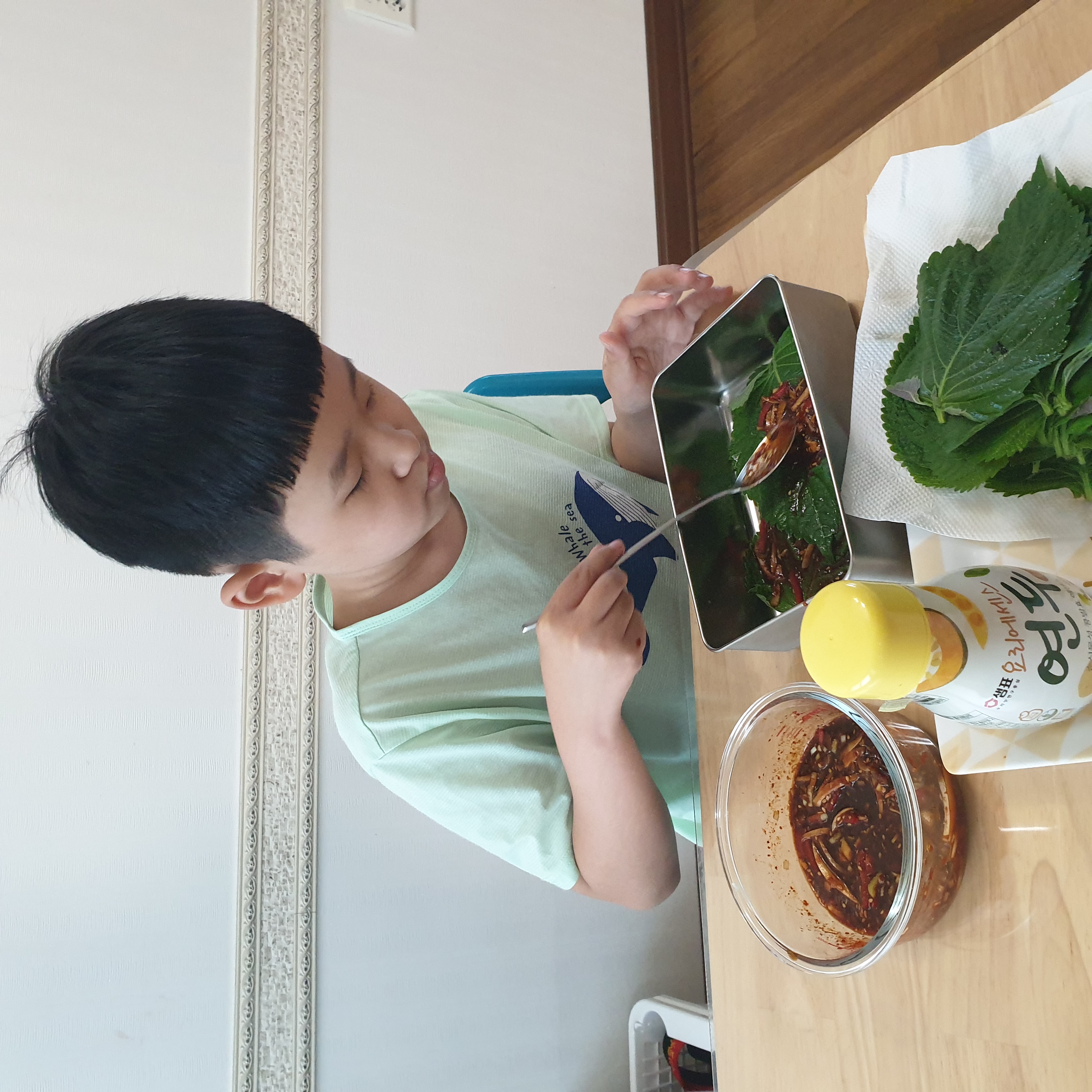 :) 갓딴 싱싱한 깻잎으로 쌈도 싸먹고 전골에도 넣어먹고도 한가득 남아서 아들 손 빌려 만든 깻잎 김치예요.