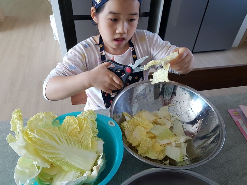 김치는 당연히 양가에서 받아먹거나 사먹는 걸로만 알던 제가 겉절이를 담근다니 스스로도 놀라웠는데요. 워낙 간단한 레시피라 반신반의하며 아이와 레시피북을 정독 후 비장한 각오로 요리를 시작했어요! 새미네 겉절이 양념과 고춧가루 6스푼을 섞어 5분간 불려두라고 되어 있는데, 저희 아이는 매운 김치를 잘 못 먹어서 3스푼으로 줄였어요. 그리고 알배추가 별로 없어서 양배추 반통을 추가했는데, 의외로 맛있어서 깜짝 놀랐답니다.