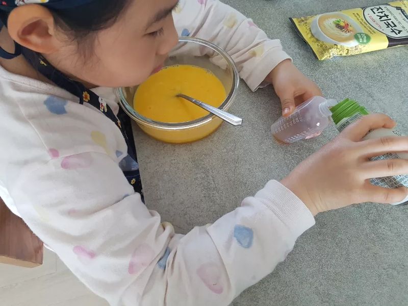 이번 계란찜의 핵심은 정확히 계량된 연두 20ml, 정확한 계량을 위해 약병까지 동원했으나 좀 더 많이 따라버린.... 하지만 어차피 물을 섞을 거니까 괜찮아요~^^; 연두가 많이 들어가면 더 맛있겠죠! ㅎㅎ 아이가 파와 연두를 섞으며 색깔이 더 선명해졌다고 신기해하더라구요. 이제 냄비에 중탕만 하면 계란찜은 끝!