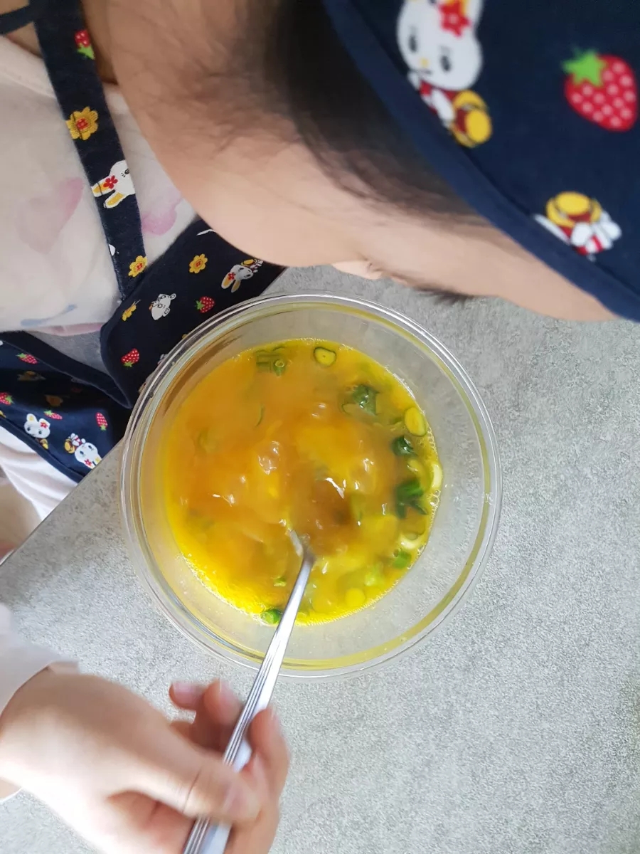 사실 저는 요린이라 할 줄 아는 음식이 별로 없어서 아이와 뭘 만들까 고민하다가 제가 가장 자신있어하는 계란찜과 맵지않은 겉절이를 만들기로 했어요. 아이는 엄마랑 요리를 한다고 신나서 앞치마와 두건까지 두르고 쌀부터 열심히 씻기 시작했어요. 평소에도 계란찜할 때 계란 풀기는 아이 담당이었는데, 이번에도 휘리릭 신명나게 섞어주더라구요~ㅋㅋ