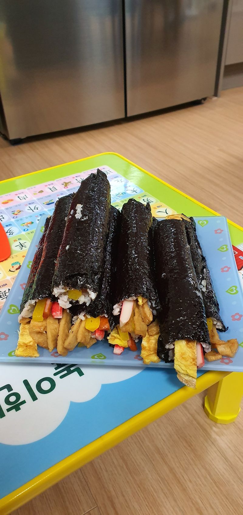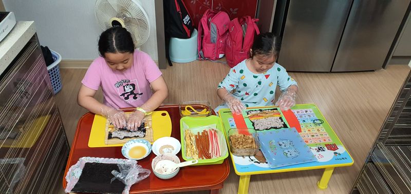 오늘의 식사는 우리가 책임질께요 재료준비 해주니 둘이서 김올리고, 밥올리고, 재료들 올려 돌돌 말아주니 맛있는 김밥이 완성♡ 고사리 손으로 만든 김밥 우리 가족들 맛있게 먹어요