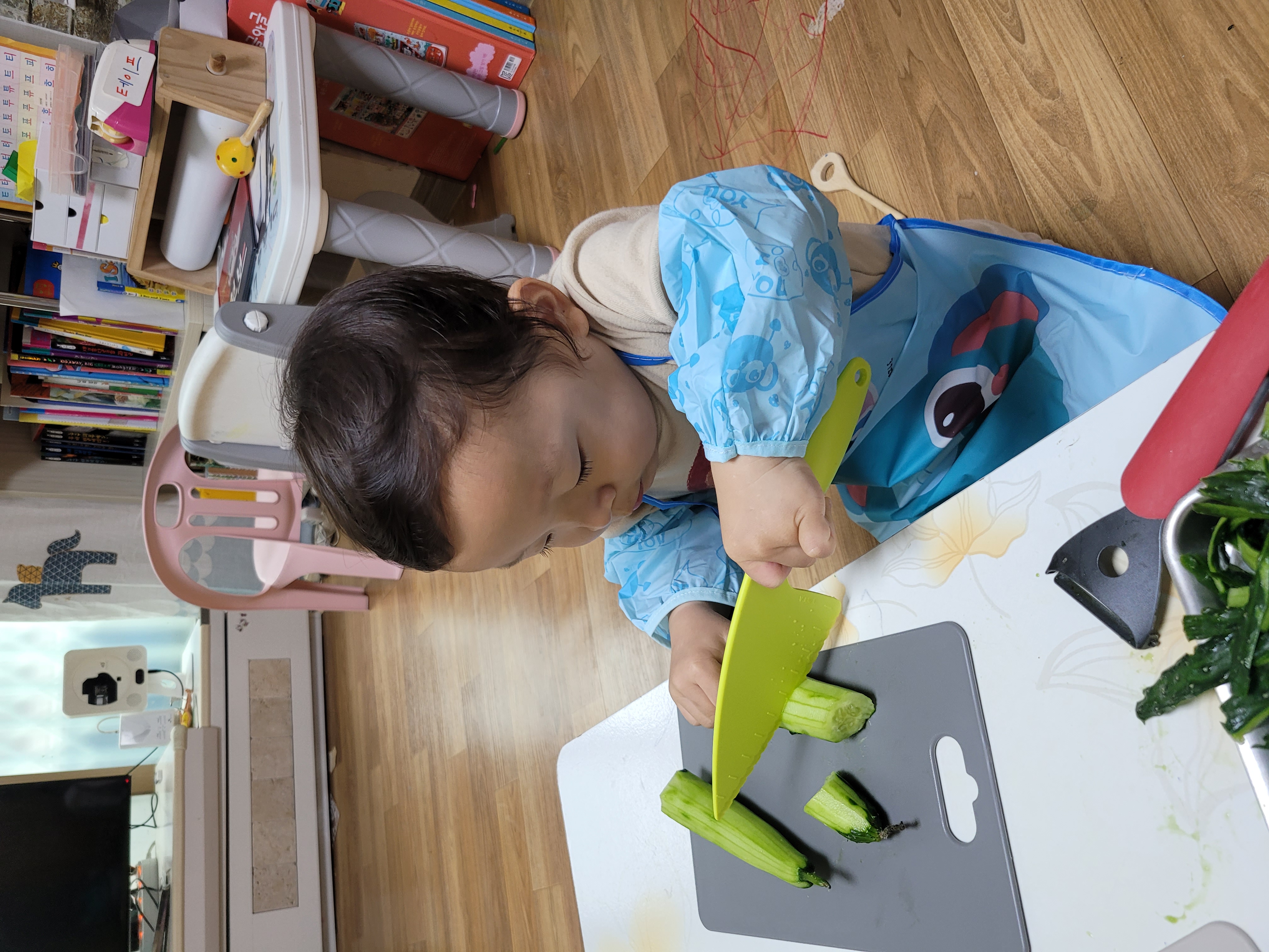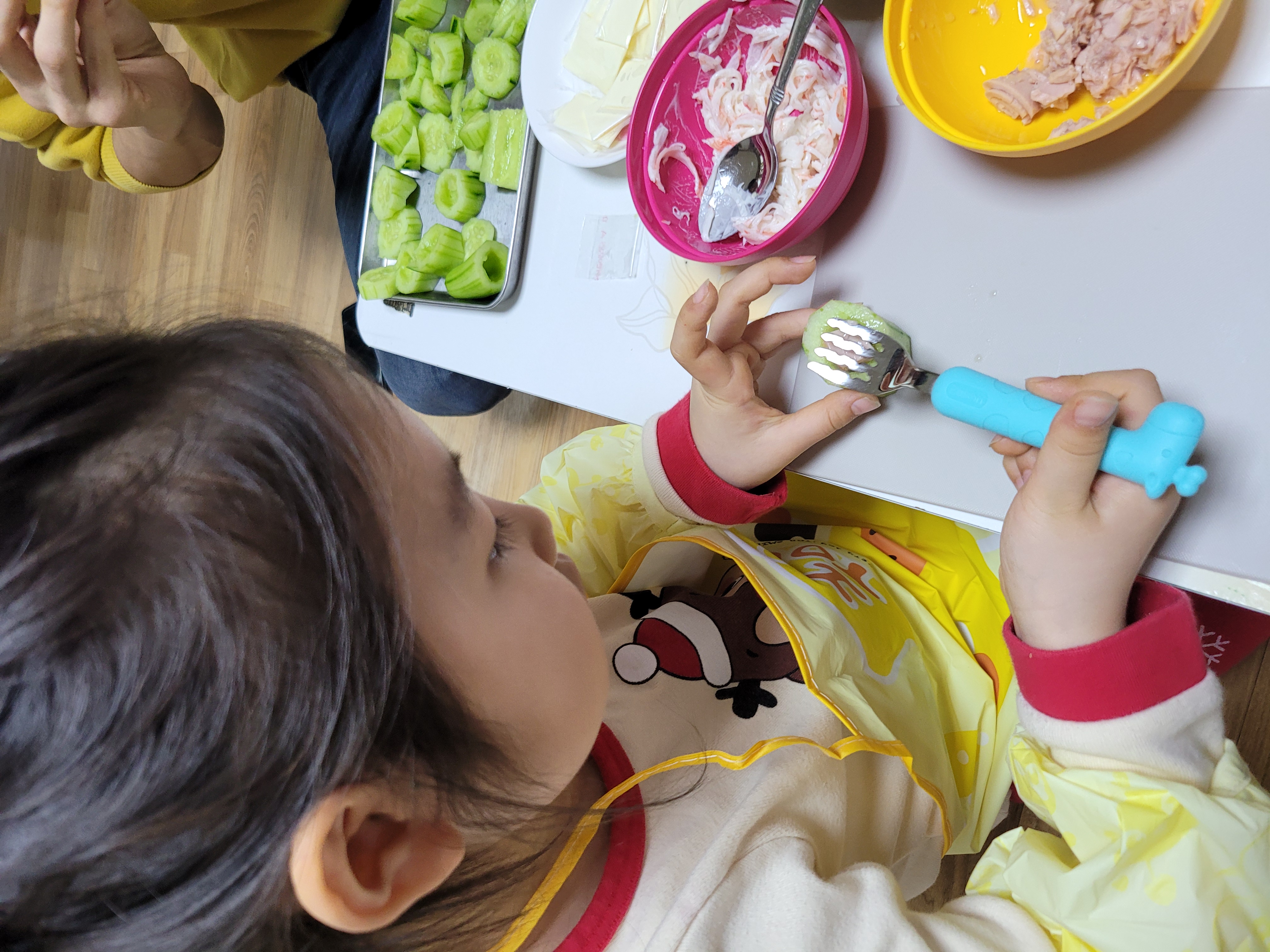 아빠랑 오이를 관찰하고 냄새도 맡아보고 파보기도 하고 부셔보기도 하면서 여러가지 토핑들을 준비해 올려봤어요~