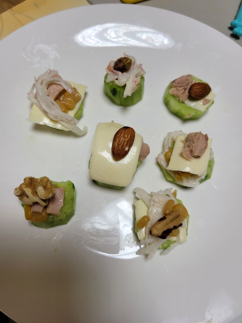 평소 잘 먹지 않던 견과류도 오이까나페로 만드니 너무 잘 먹네요~^^