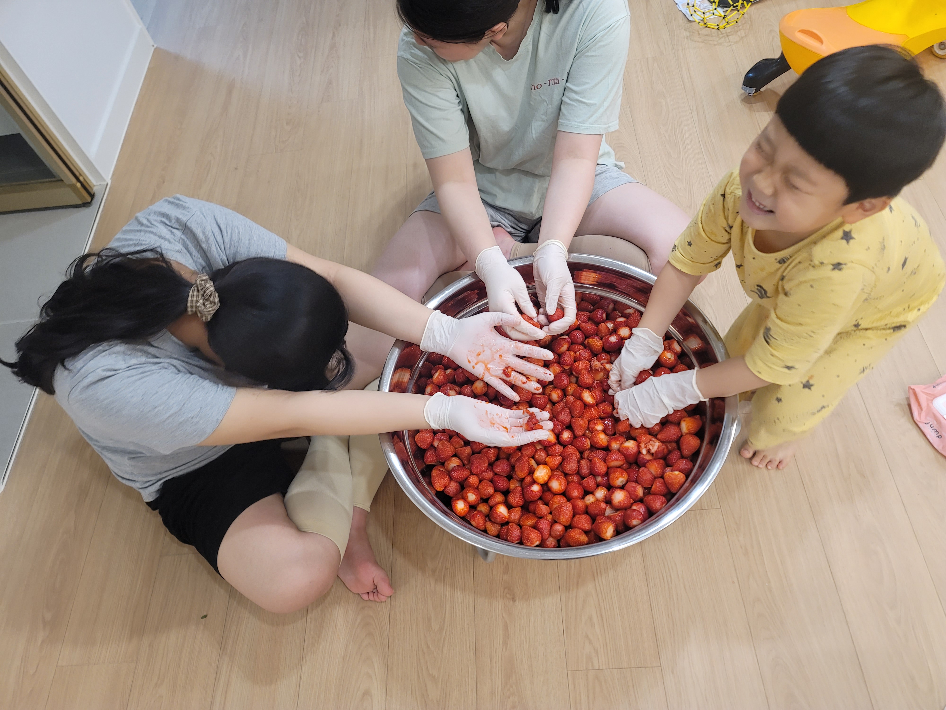 누나들과 넷째막둥이 남동생 조물조물 촉감놀이겸 딸기 수제청 만들어요 10kg라는건 안비밀~~~🤪