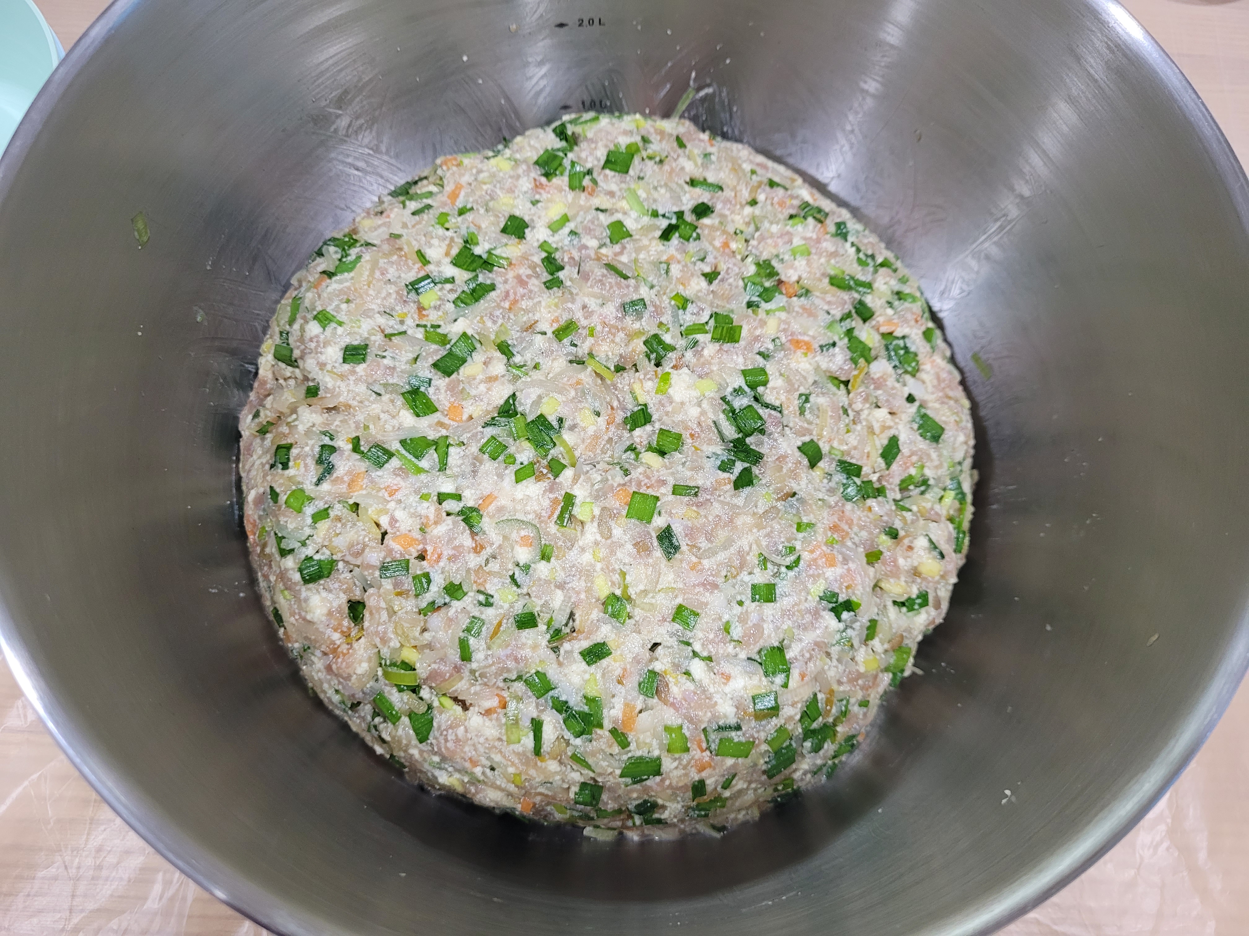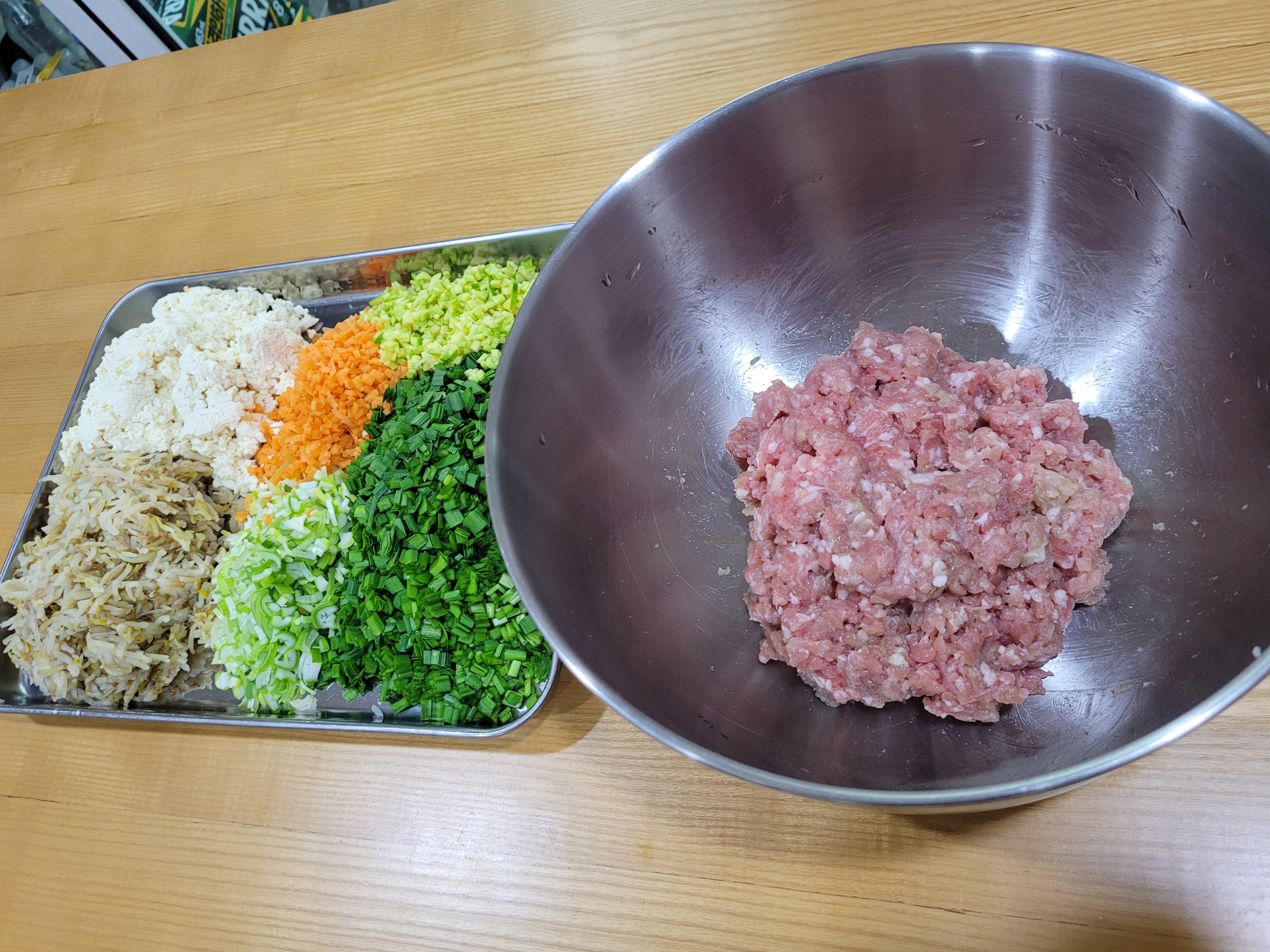 다진돼지고기(소고기). 두부. 양파. 대파. 당근. 부추. 숙주. 호박. 브로콜리등등 넣어주고