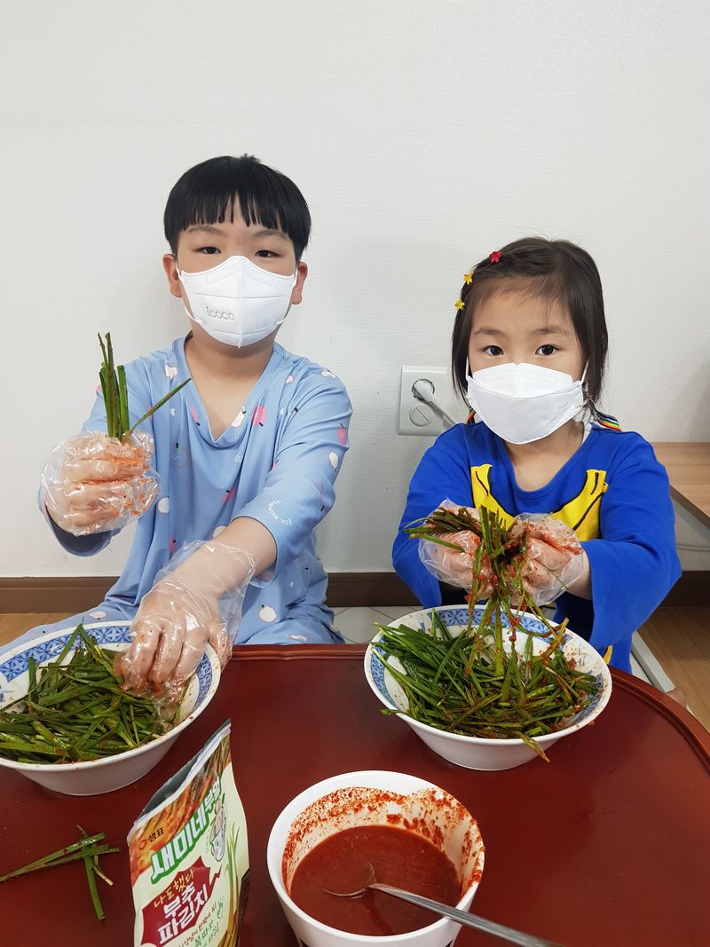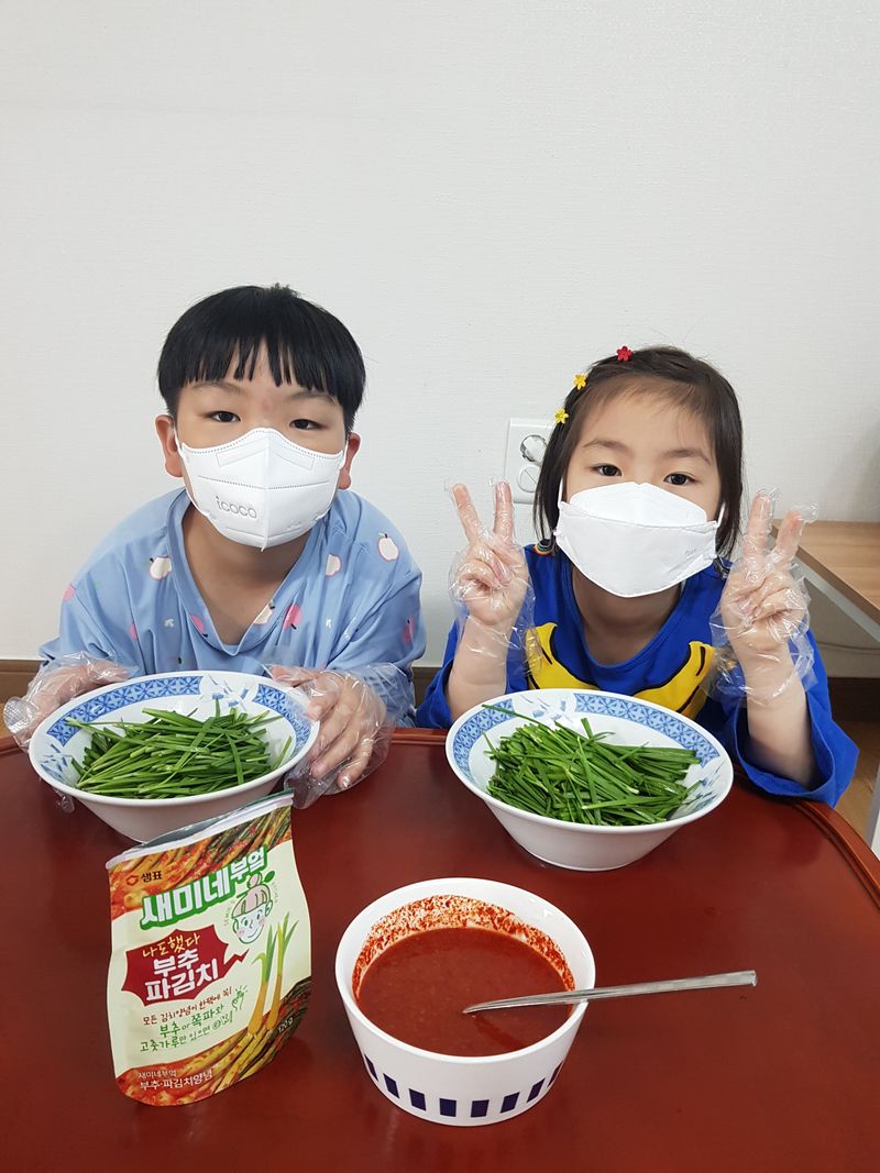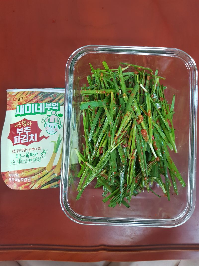 아이들이 좋아하는 부추로 부추김치를 만들었어요. 직접 양념해서 조물조물 무쳐 예쁜 그릇에 담으니 너무 먹음직스럽네요^^ 오늘 저녁은 함께 만들어 더 맛있는 부추김치와함께 맛있는 저녁을 먹겠습니다^^