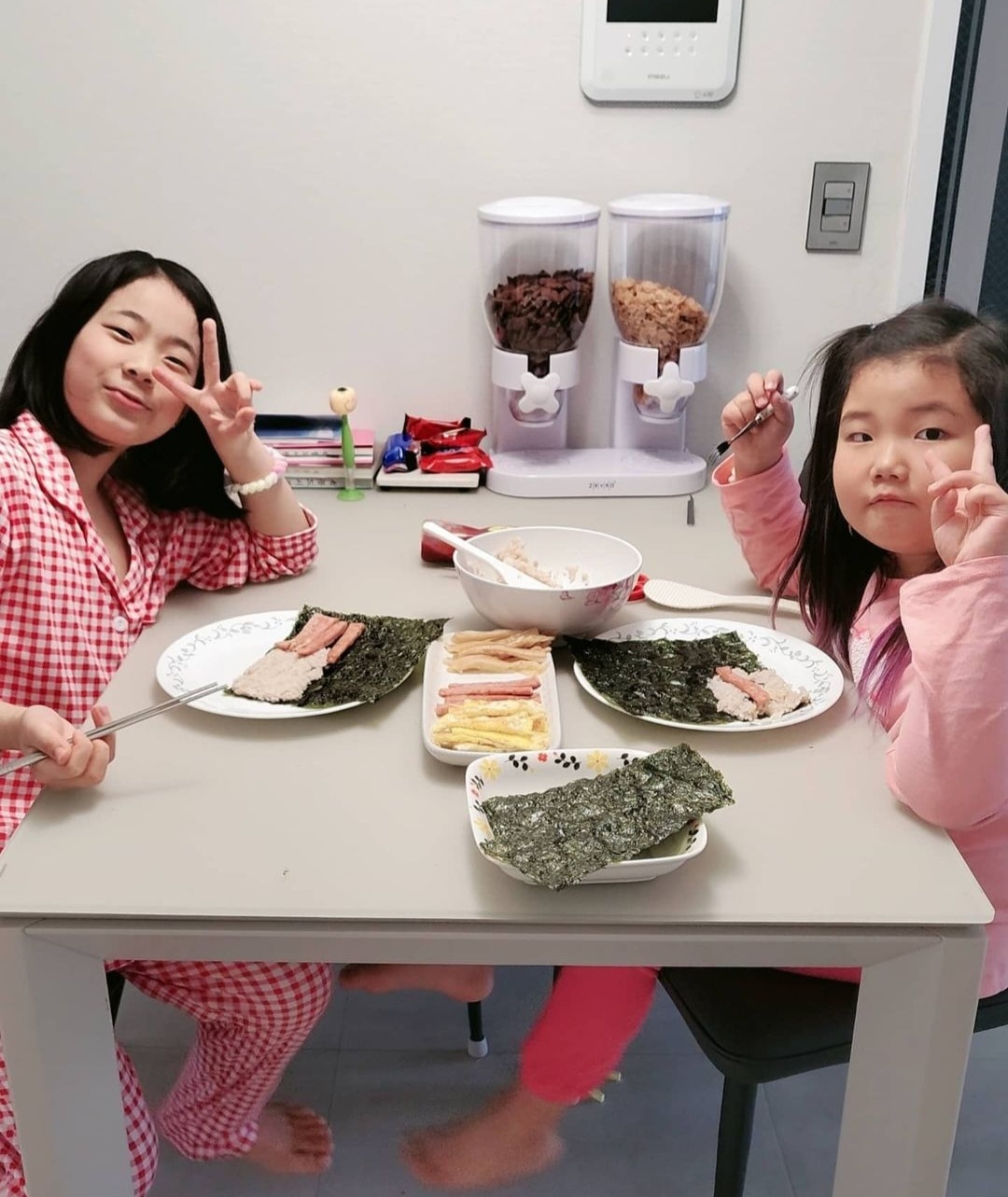 꼬수운 참기름 밥에 솔솔 뿌려 조물조물 묵은김치 무치고, 햄 구워구워 계란 풀어 지단만들고 넣고싶은 재료들 약3가지 만든후 네모난 김을 4등분 해서 재료한가지씩 한가지씩 놓고 소스도 좋아하는걸로 뿌려주세요~ 색종이접듯 착착착착 포개주면 맛있는 네모김밥 완성~~~~~ 아주아주 쉬워요 친구들,동생들,언니오빠들 모두함께 만들어보아요~~~~