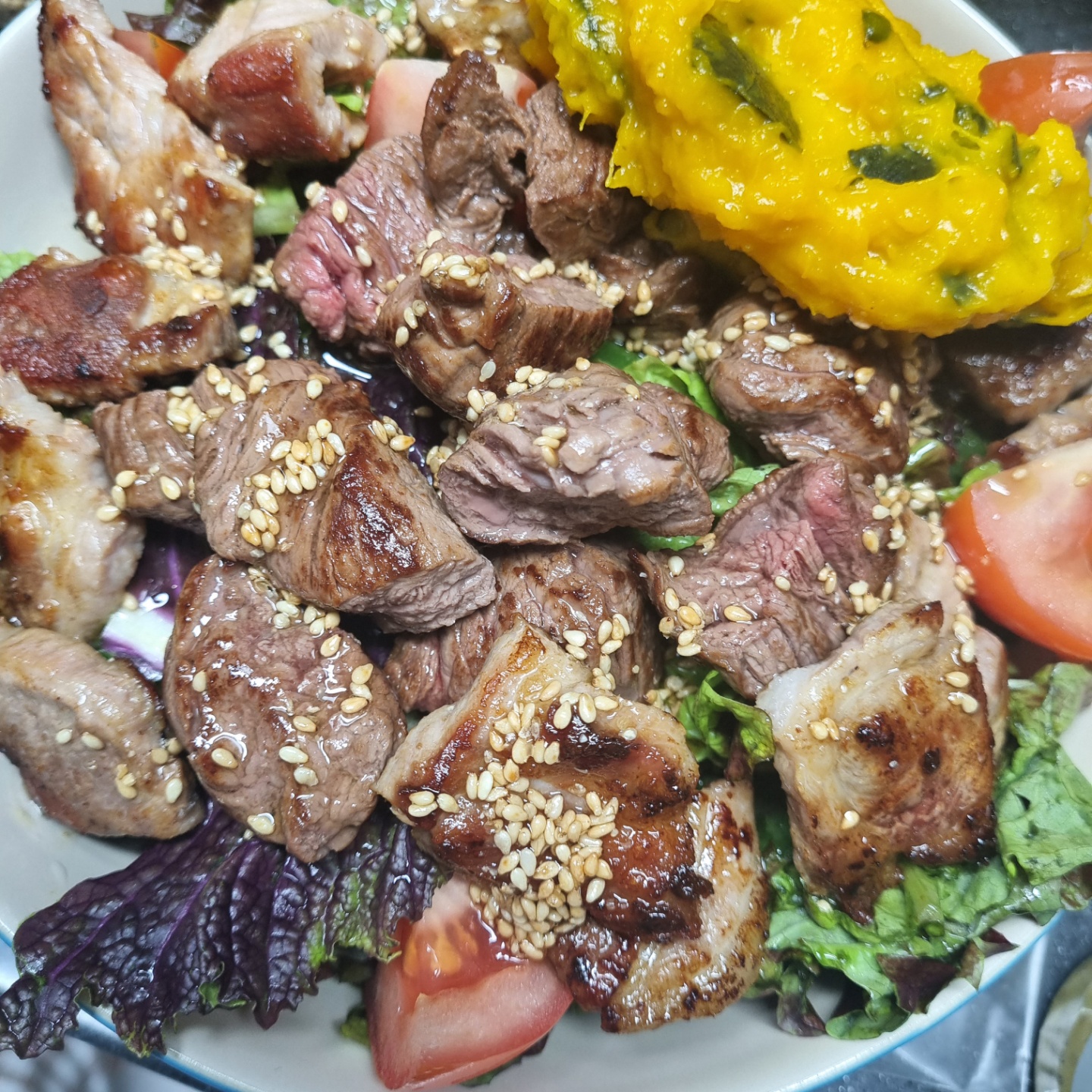 1. 재료 : 쌈채소, 단호박, 고기, , 토마토, 연두(순), 참기름, 깨