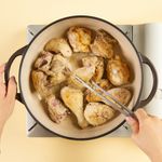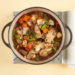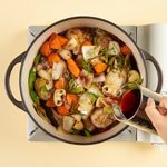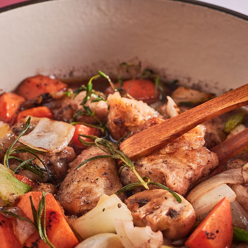 같은 냄비에 양파, 당근, 샐러리, 양송이버섯을 넣고 중불로 줄여 5분간 볶아주세요. 분량의 레드와인과 연두순, 부재료(타임, 월계수잎, 로즈마리), 구운 닭고기를 넣고 중불에서 30분간 끓여주면 완성!