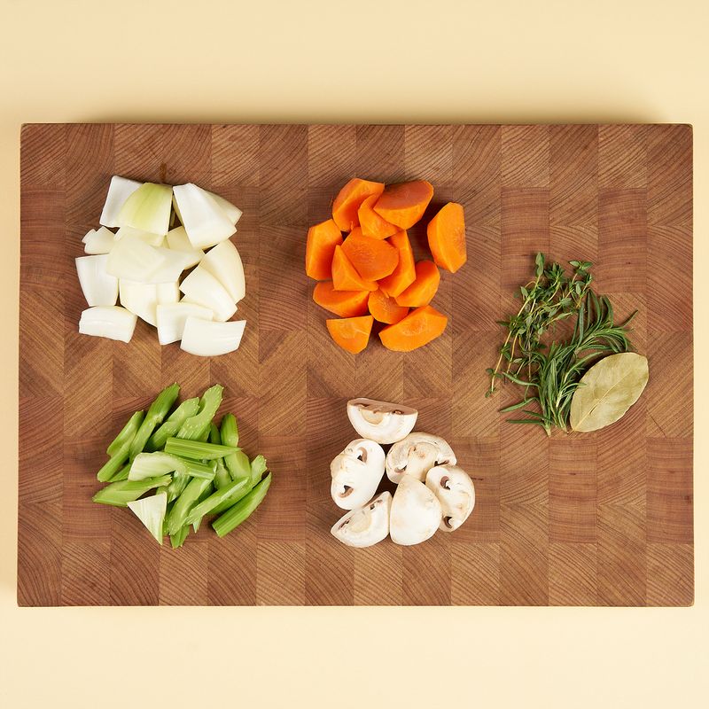 양파는 사방 2cm 크기로 깍둑 썰어 주세요. 샐러리는 2cm 길이로 자르고, 당근은 들쭉날쭉 마구 썰기하고, 양송이버섯은 2등분해 주세요.
